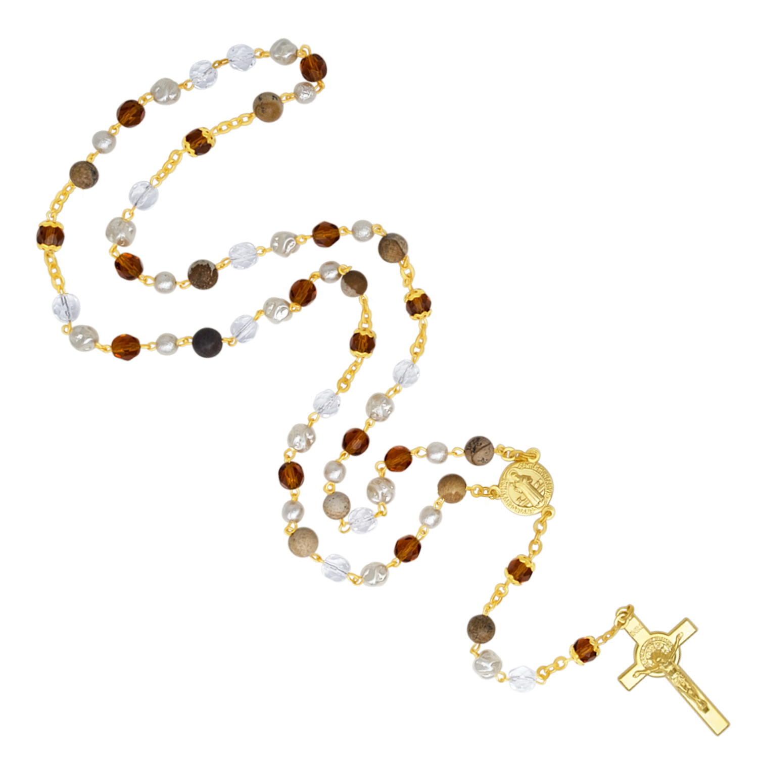 Crafted with luminous crystals and natural stones, this rosary is accented with radiant 18k gold-plated metal. The harmony of bronze and earthy tones meets a St Benedict golden crucifix and St Benedict medal, providing protection to those who pray it with faith.