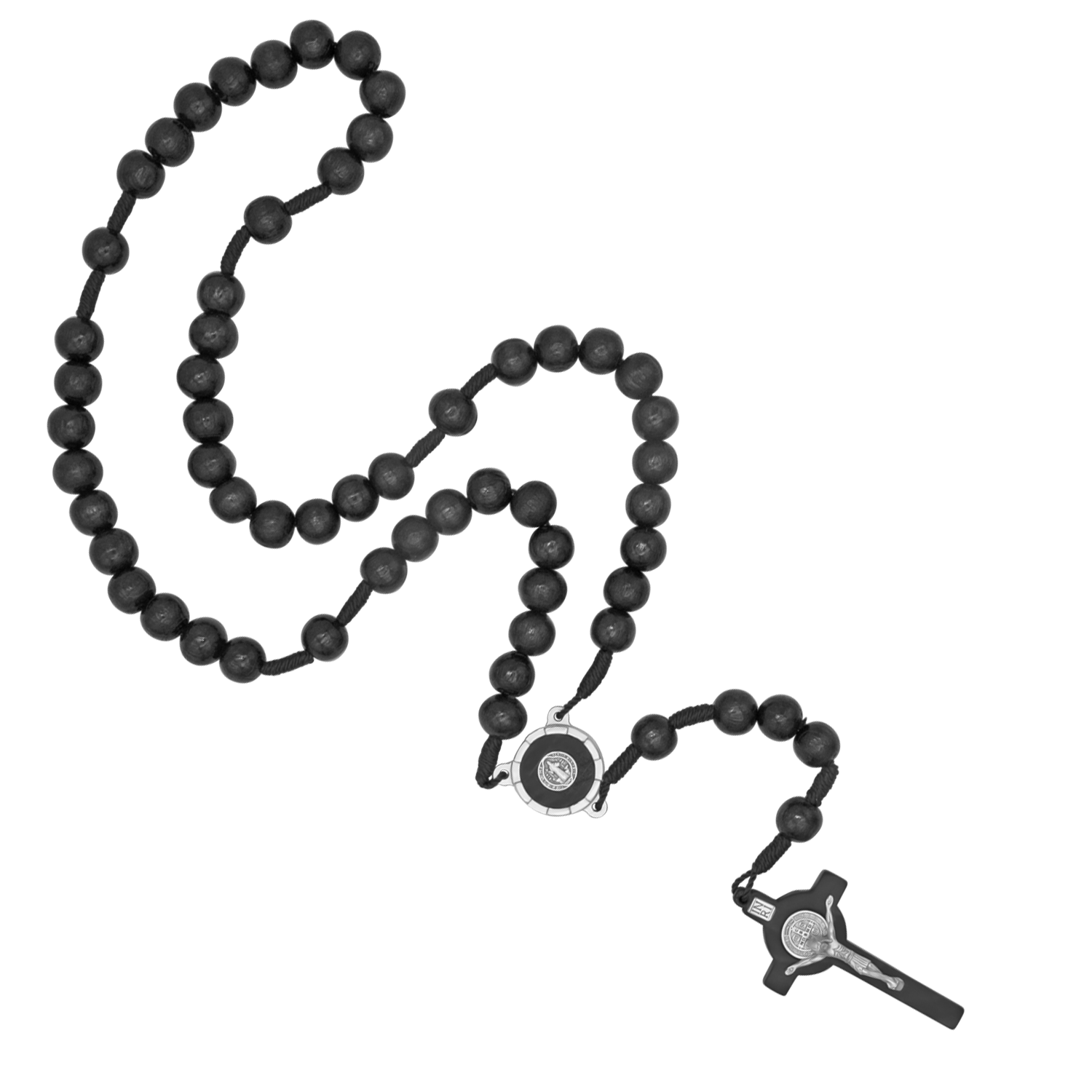 St Benedict large rosary black beads. This handmade rosary, featuring large black wooden beads, embodies a powerful symbol of protection through the Saint Benedict medals, traditionally invoked against evil. The durable cord binding enhances its artisanal charm, while the rosary is completed with a classic Saint Benedict crucifix pendant.