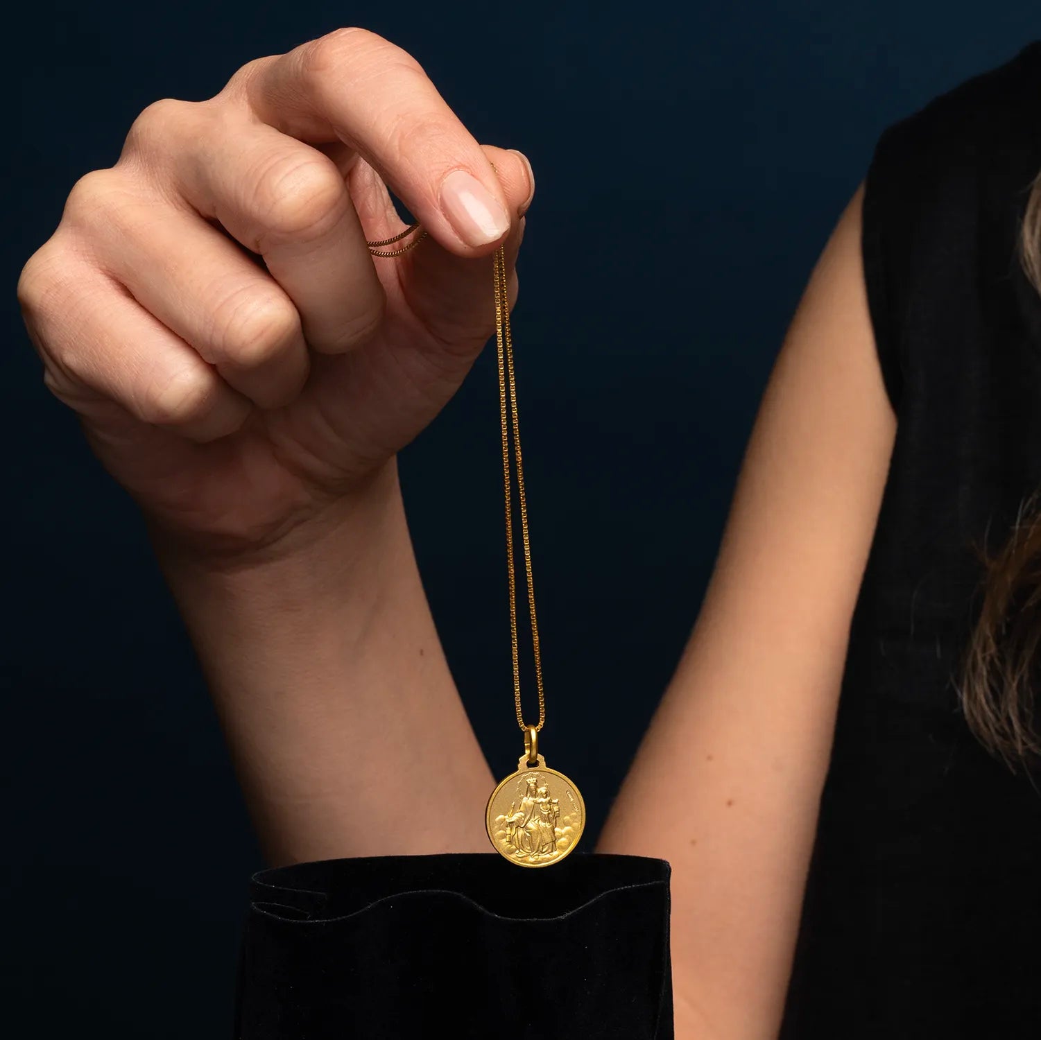 The Scapular medal depicts the Sacred Heart of Jesus on the obverse, and Our Lady of Mount Carmel on the reverse, symbolizing Christ’s love for humanity and salvation, respectively.