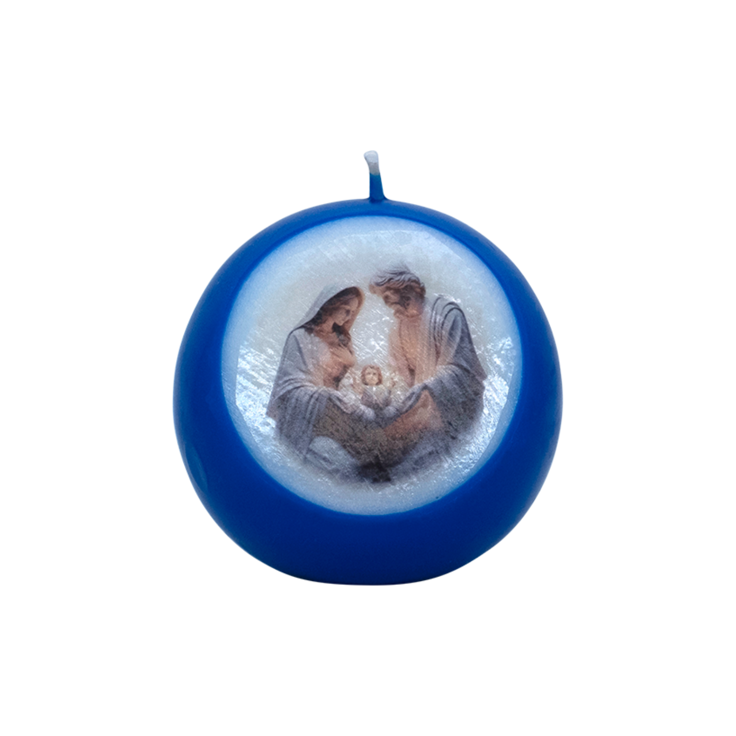 This Nativity scene blue candle embodies timeless elegance, featuring a delicate depiction of the Holy Family framed in soft white and vibrant red tones. Hand-painted in Italy, it adds a warm and graceful glow to your Christmas décor.