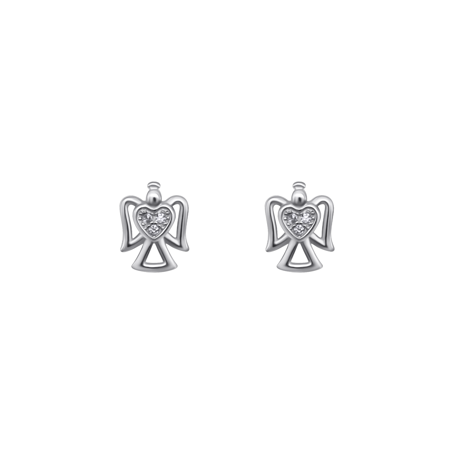 These sterling silver earrings depict the shape of a small angel, symbol of spiritual guide. These precious earrings are embellished with white shiny zircons which make them such a romantic Catholic jewel.