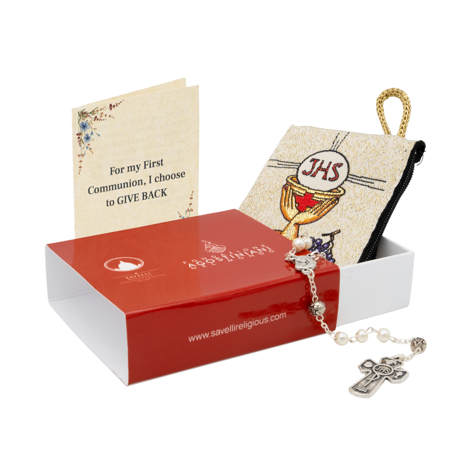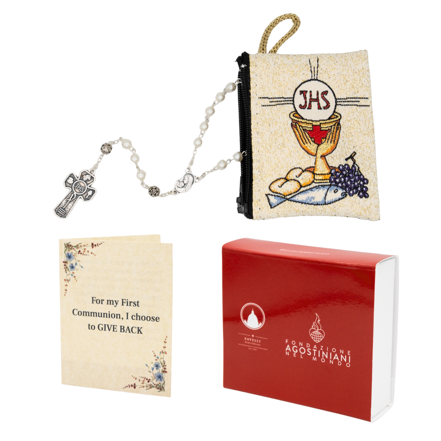 Created through an exclusive collaboration, this First Communion rosary set is a charity favor designed by Savelli Religious for OSAFUND, supporting the Foundation’s mission to bring hope and dignity to communities in need.