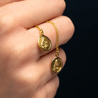 This 18k gold Scapular necklace showcases two small medals depicting the images of Our Lady of Mount Carmel and the Sacred Heart of Jesus. The origins of the Catholic Scapular traces back to 1251, when the Virgin Mary appeared to Simon Stock, the prior general of the Carmelites. She bestowed the scapular upon him as a new, more powerful habit for his order, promising salvation to those who would wear it.
