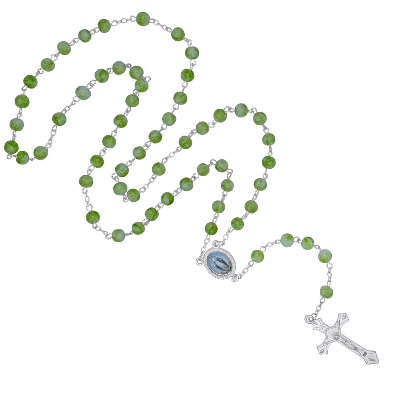 Holy rosary for your daily heartfelt prayers featuring green glass beads with marble effect and metal binding. The central medal depicts the Blessed Mother of Jesus, the Holy Virgin Mary.