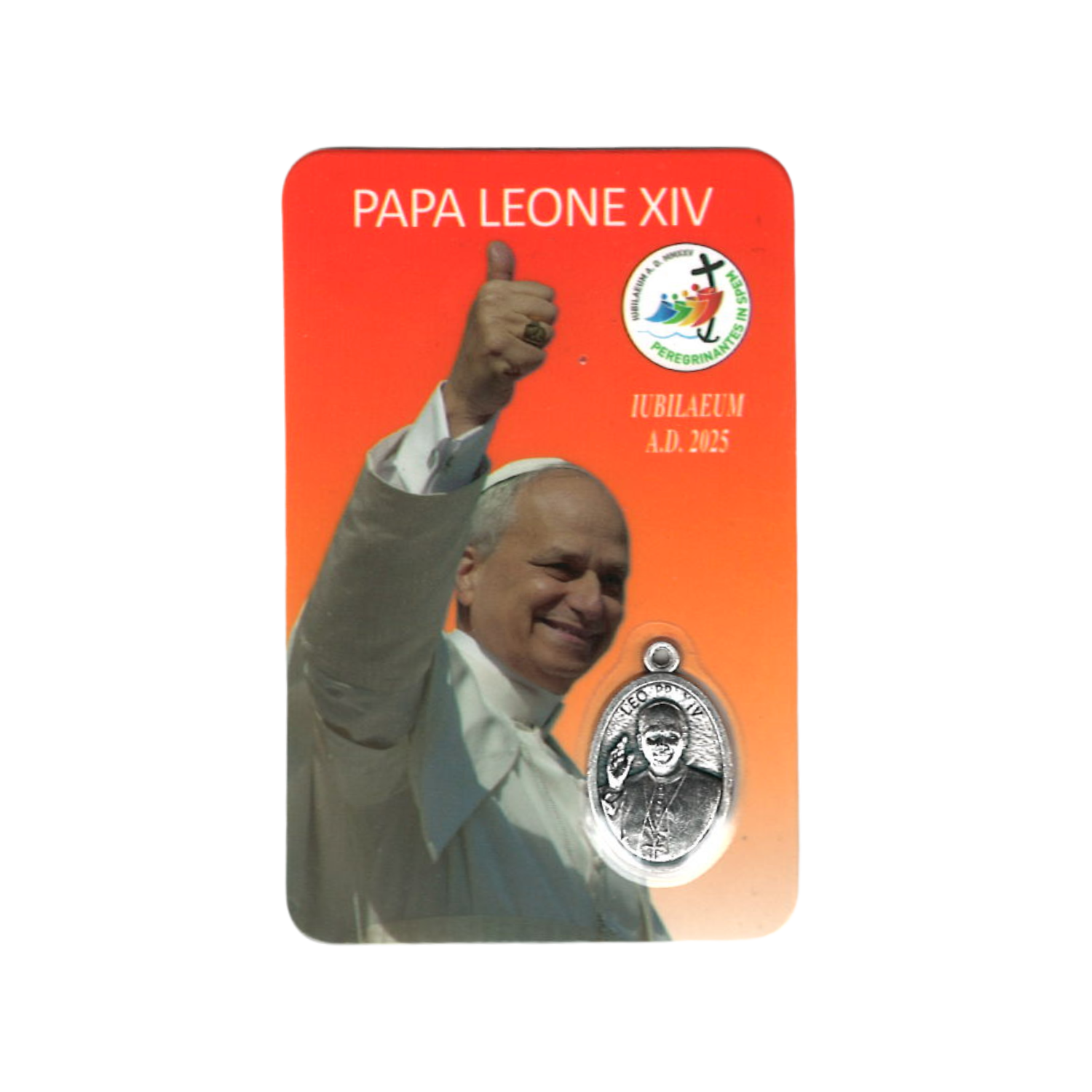 Laminated Catholic holy card representing Pope Leo featuring a metal medal. On its back, there is the sentence "Take Courage! Without fear! Many times in the gospel Jesus says: 'Do not be afraid' " in Italian, English, Spanish, French, German, Portuguese and Polish.