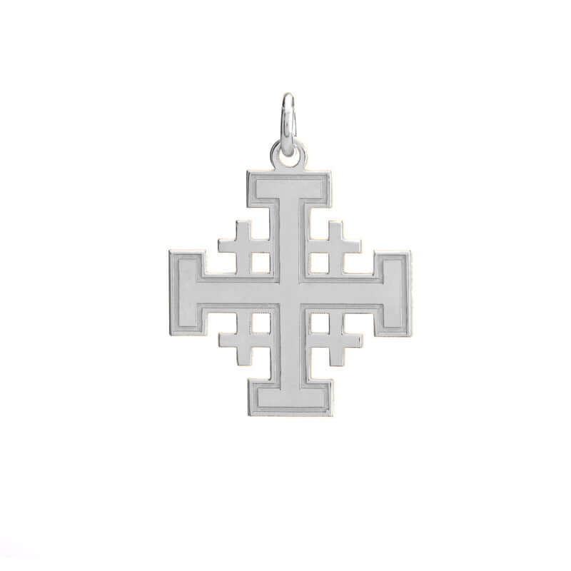 Jerusalem Cross made of Sterling Silver. The origin of this five-fold cross dates back to the 11th century and was later adopted as the coat of arms of the Kingdom of Jerusalem. The most popular interpretation has it that the five crosses symbolize the Five Wounds of Christ.