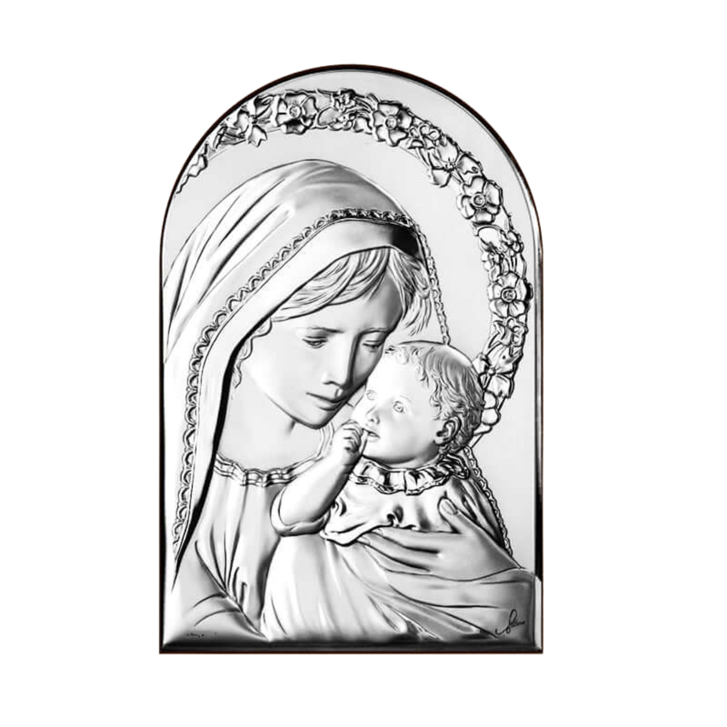 Picture depicting the Madonna and Child. Sterling Silver bilaminate plaque on walnut wood back. You can both hang it on the wall or place it on your furniture. Available in three different sizes.