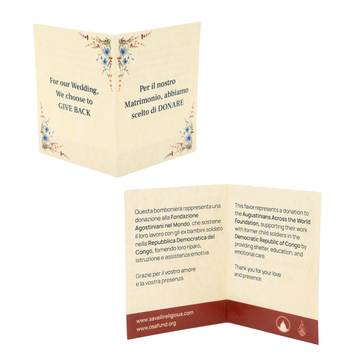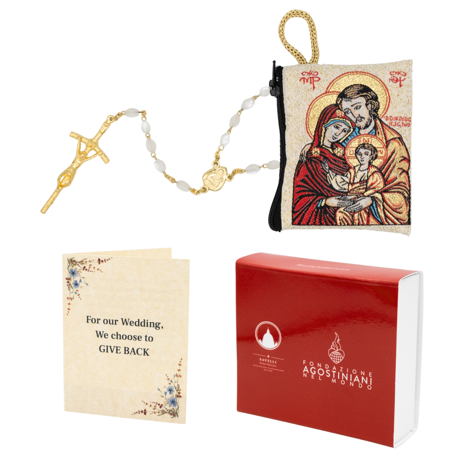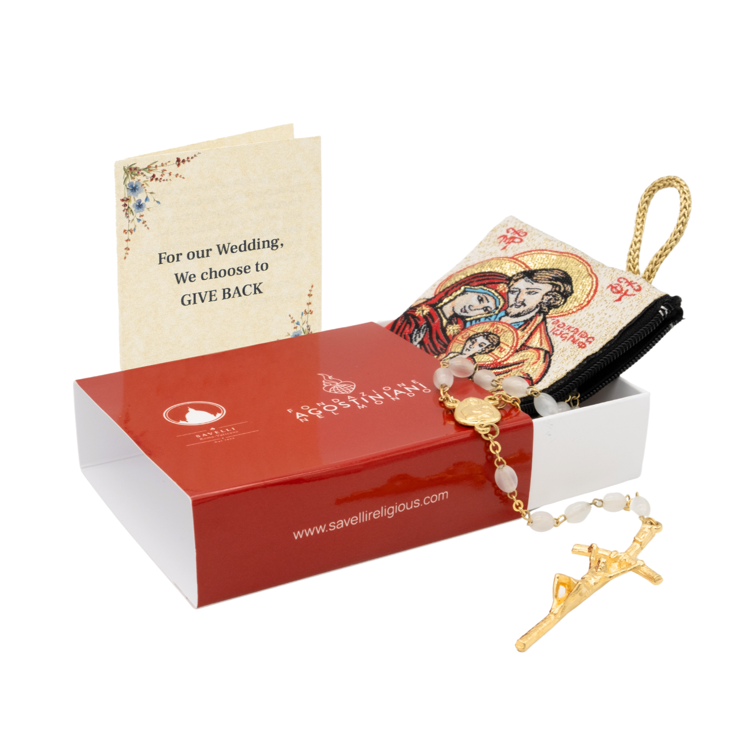 Created through an exclusive collaboration, this rosary set is a charity wedding favor that has been designed by Savelli Religious for OSAFUND, supporting the Foundation’s mission to bring hope and dignity to communities in need.