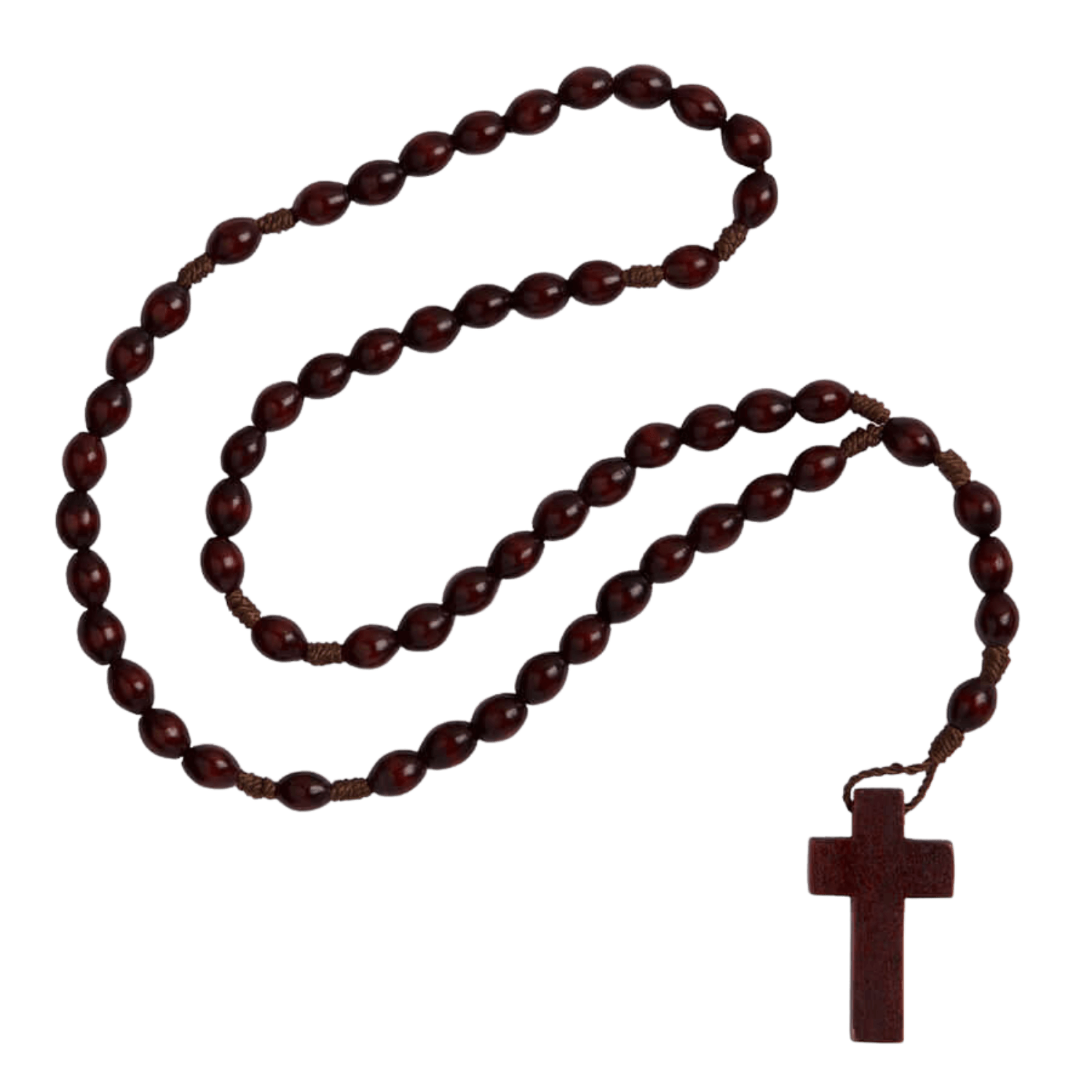 A classic rosary with a simple and essential design, featuring dark wood beads and rope binding. Symbol of humility and poverty, the wooden beads suggest the most intimate prayer on your faith path.