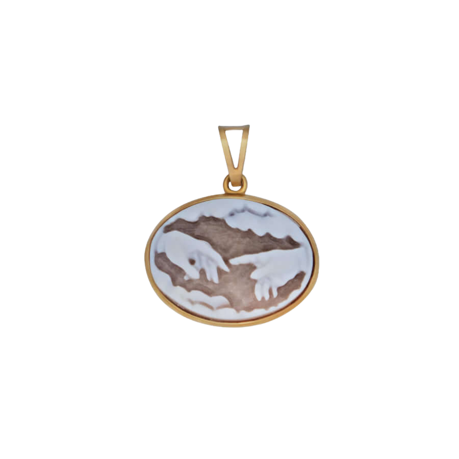 Precioso colgante de oro amarillo de 18K que representa el detalle de las manos de la "Creación de Adán", de Miguel Ángel. Esta es una joya camafeo con elegancia clásica y un fuerte significado cristiano, finamente elaborado por artesanos italianos.