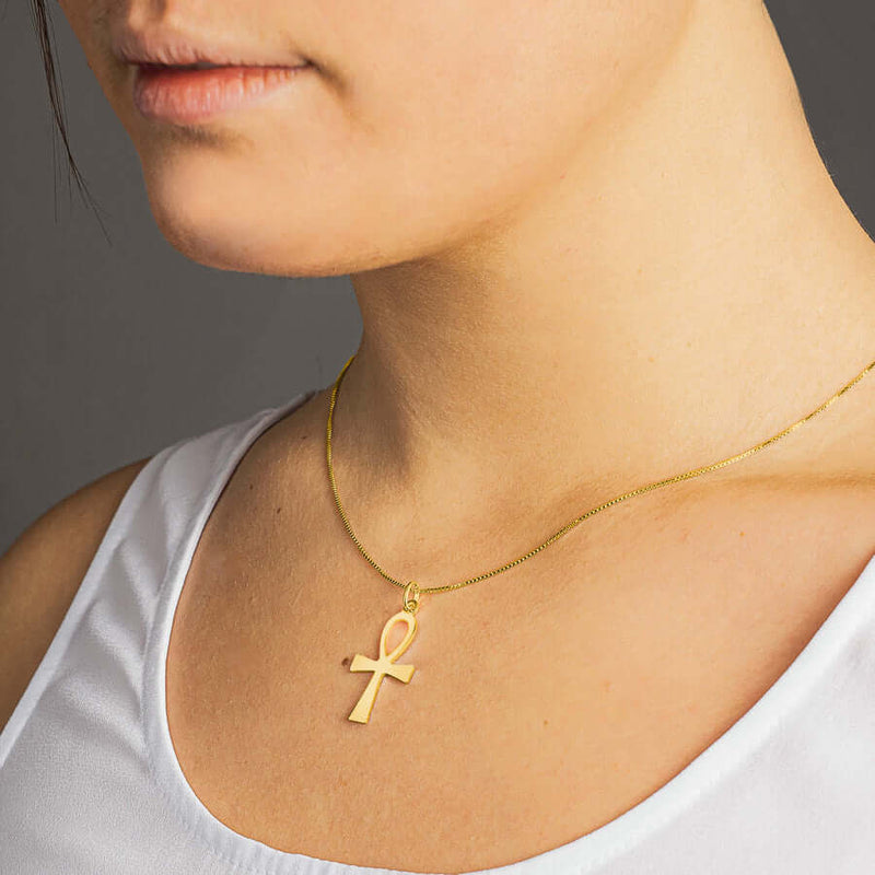 Colgante Cruz de la Vida, también conocida como Cruz Egipcia o Ankh, realizada en oro 18K. Disponible en dos medidas diferentes.