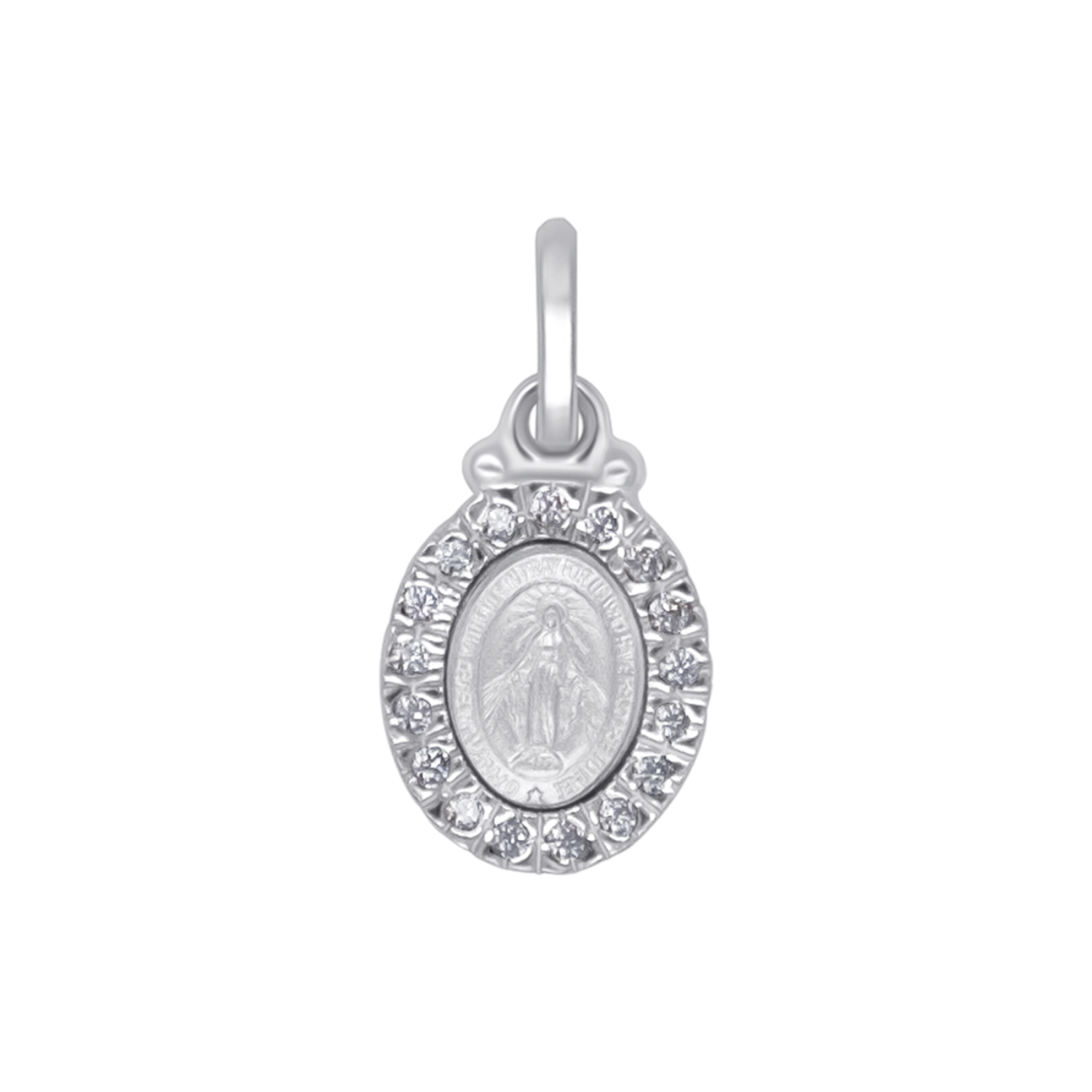 Colgante en Plata y Circones blancos. El relieve del colgante representa la primera aparición de la Virgen a Santa Catalina. A partir de aquí la historia de la Medalla Milagrosa será un gran símbolo de gracia para aquellos que la lleven con confianza. Ofrézcala a los que sufren, los enfermos y los que no tienen más fe. Elaborada a mano por nuestros artesanos.