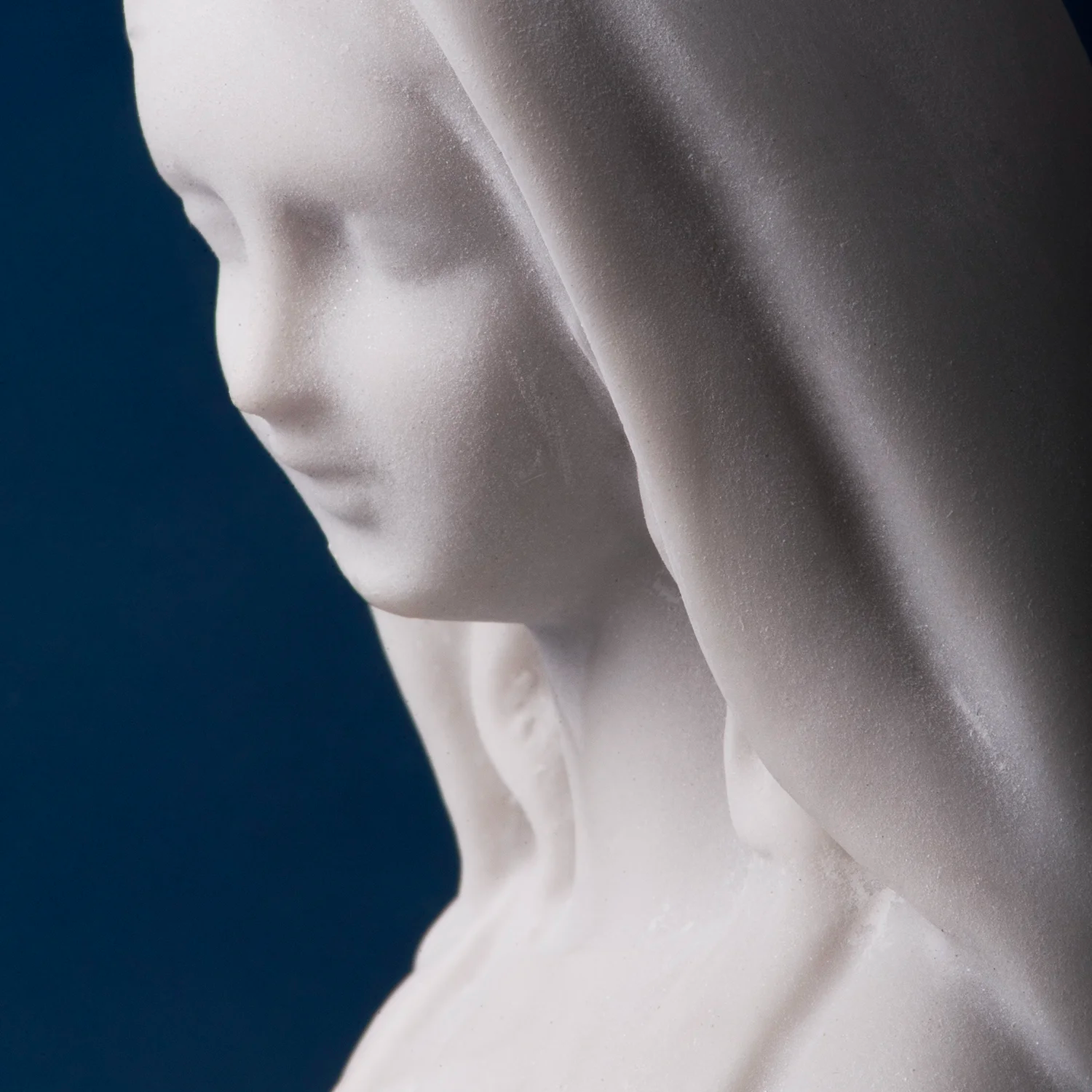 Estatua hecha en mármol blanco representando a la Virgen Milagrosa.