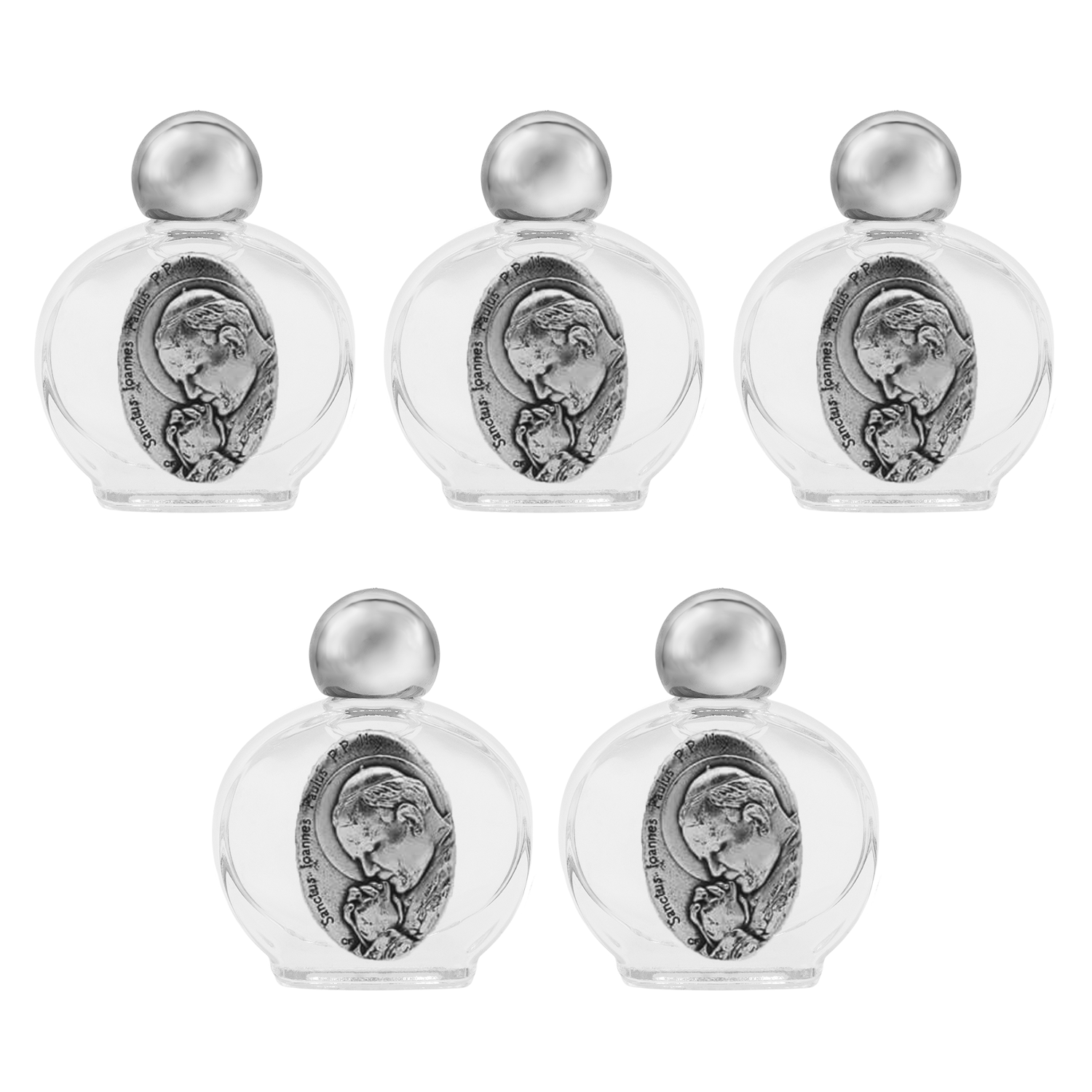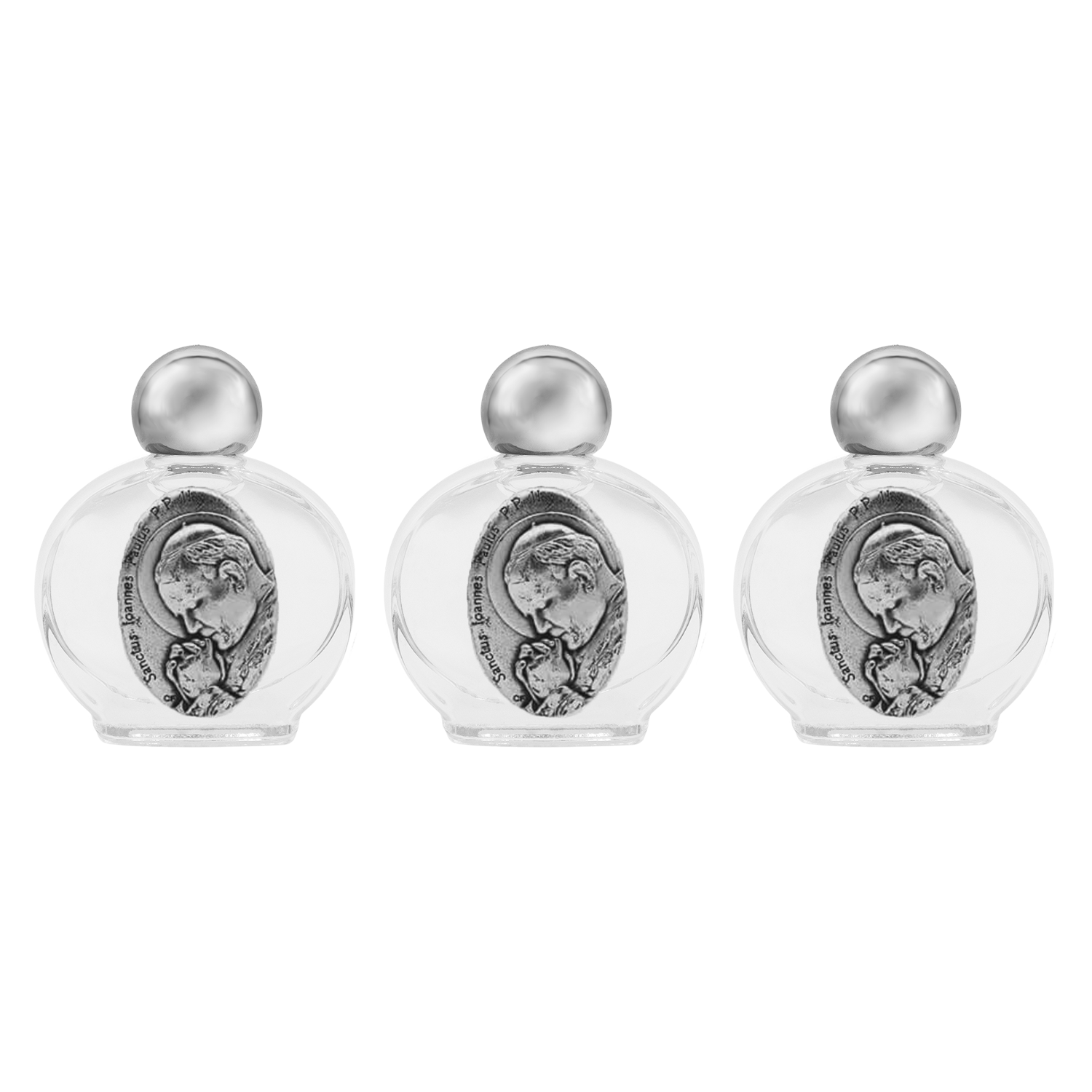 Conjunto de botellitas de vidrio de 10 ml decoradas con placa metálica de Papa Juan Pablo II, disponible en presentaciones de 3 o 5 piezas.