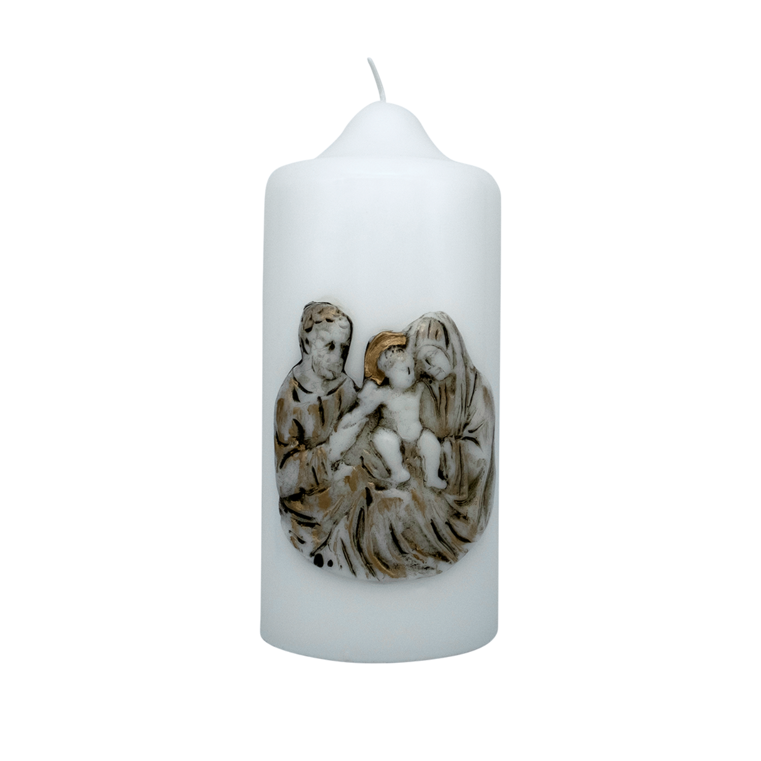 Vela Votiva representando a la Sagrada Familia, enteramente realizada en cera pintada a mano. Esta vela religiosa, que también puede ser utilizada como vela decorativa, representa la Sagrada Familia y es perfecta para recitar las Novenas y bien como idea regalo de Navidad para una familia cristiana recién formada.