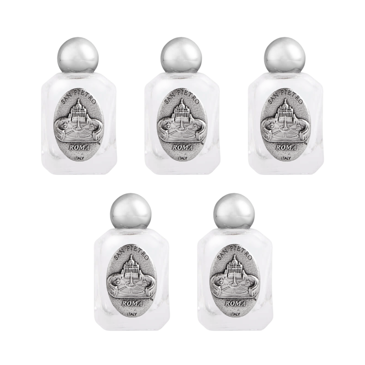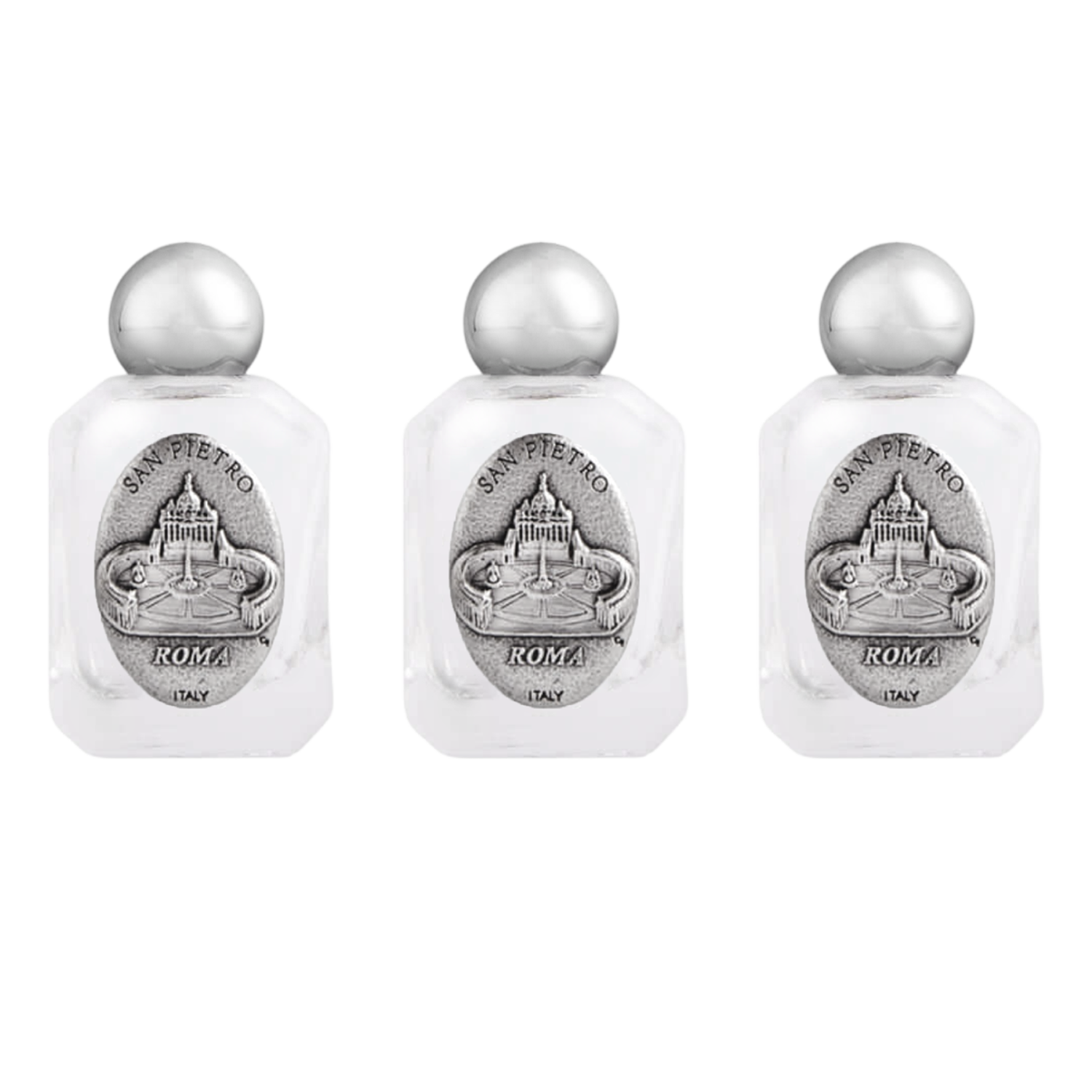 Conjunto de botellitas de vidrio de 10 ml decoradas con placa metálica de la Plaza de San Pedro, disponible en presentaciones de 3 o 5 piezas.