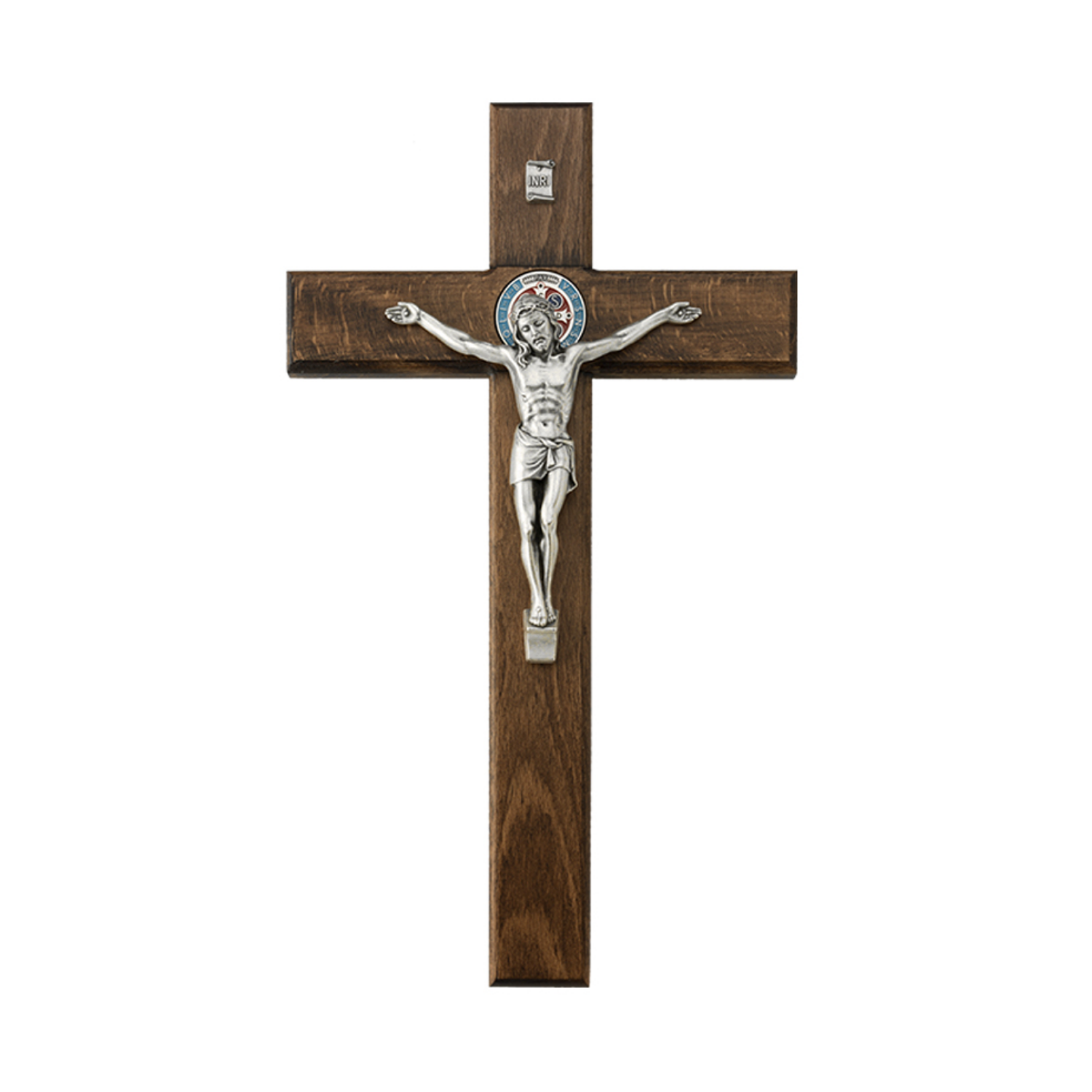 Crucifijo de pared de San Benito, enteramente hecho en madera y conexión en metal. Atrás de la imagen de Cristo, hay la famosísima medalla de San Benito, con la poderosa inscripción para los exorcismos.