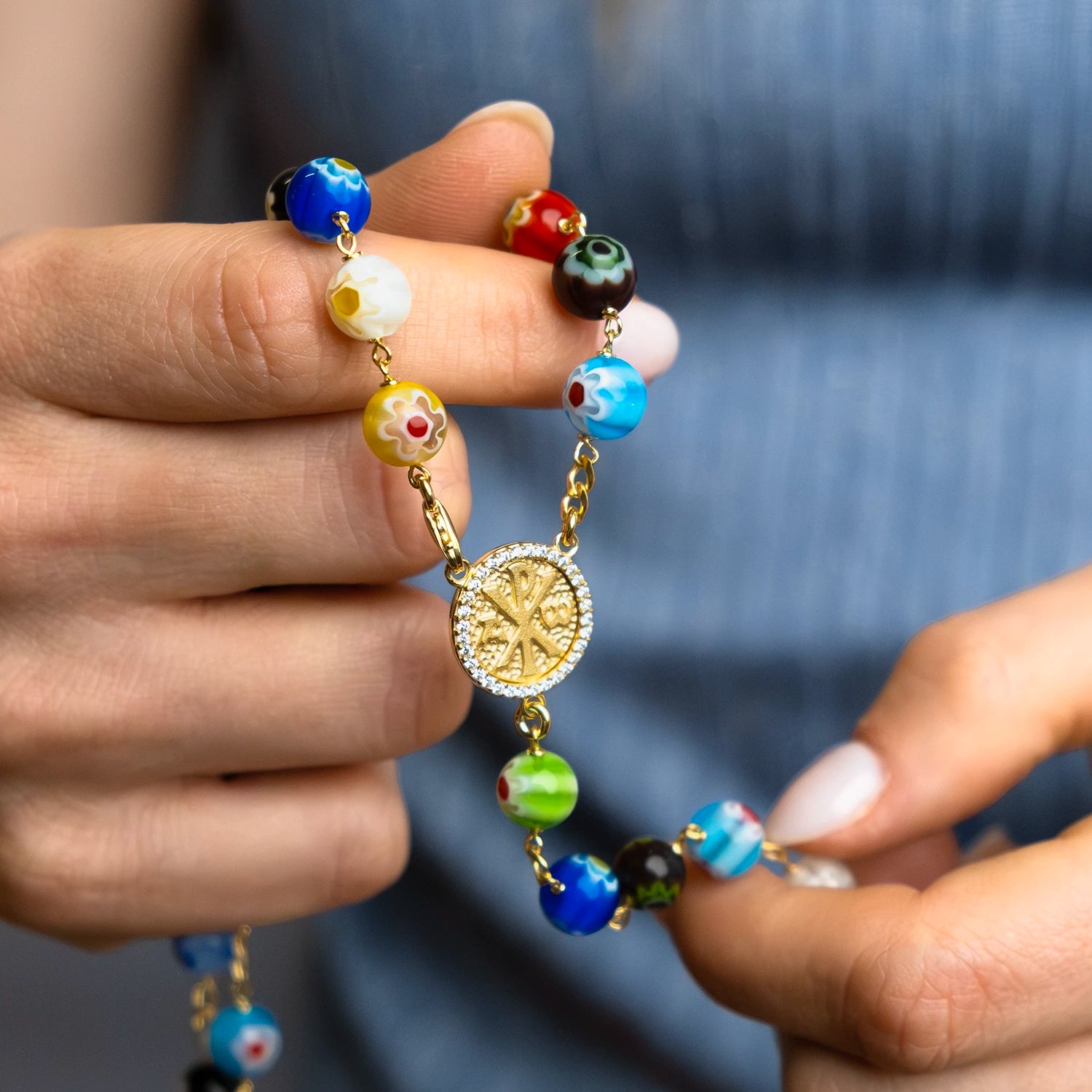 Una viva explosión de colores caracteriza este rosario en plata dorada, definiendo con originalidad su estilo moderno y contemporáneo. Adornado con auténticas cuentas de cristal de Murrina, la medalla central del rosairo representa el símbolo Chi-Rho en el frente y la Mater Ecclesiae en el reverso.