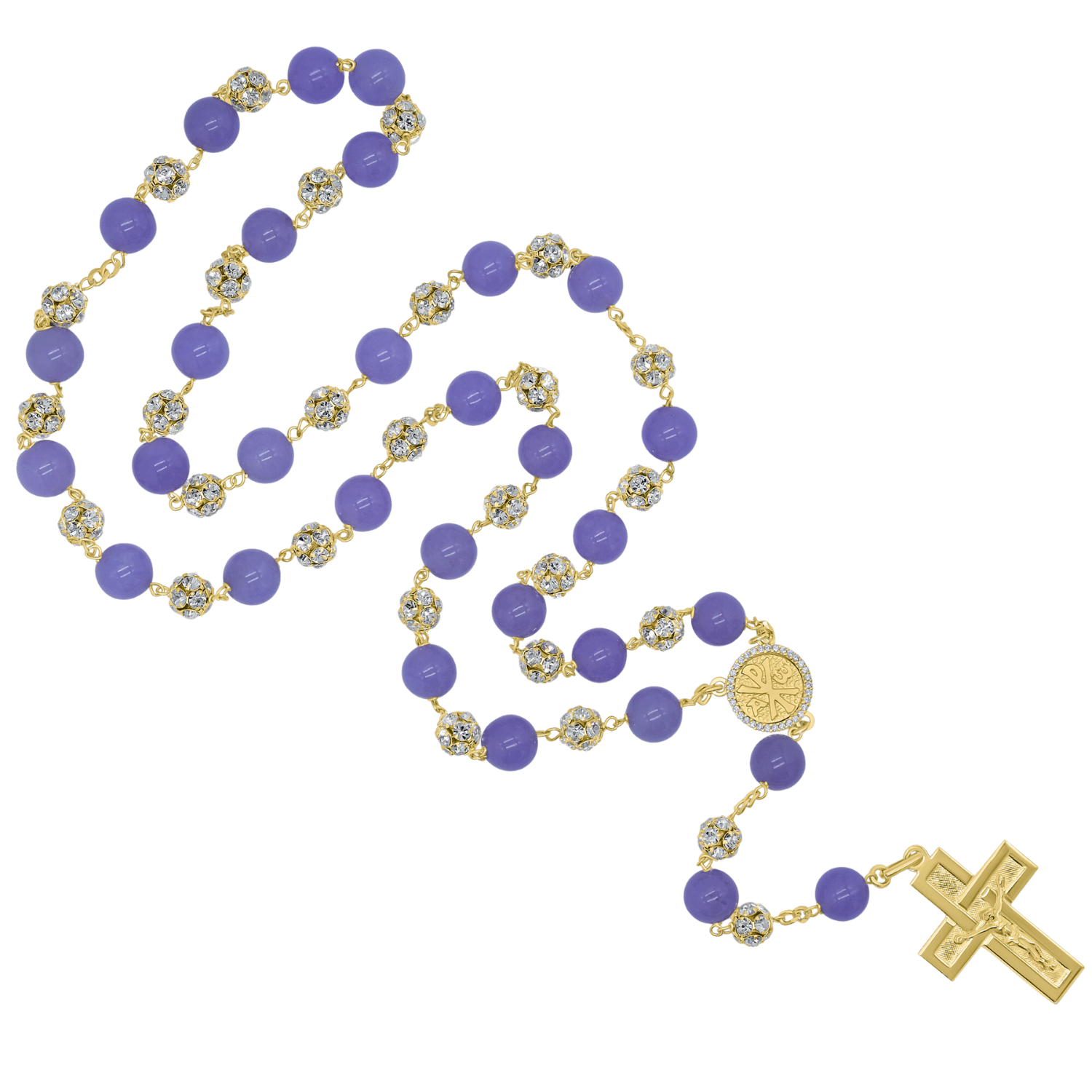 Luminosas cuentas de Swarovski se alternan con auténticas piedras de ágata morada, dando una refinada elegancia al diseño de este rosario. En el centro, se encuentra el símbolo Chi-Ro, tachonado de circonitas blancas, y en el reverso la imagen de la Mater Ecclesiae. Encuadernación en plata bañada en oro de 18K.