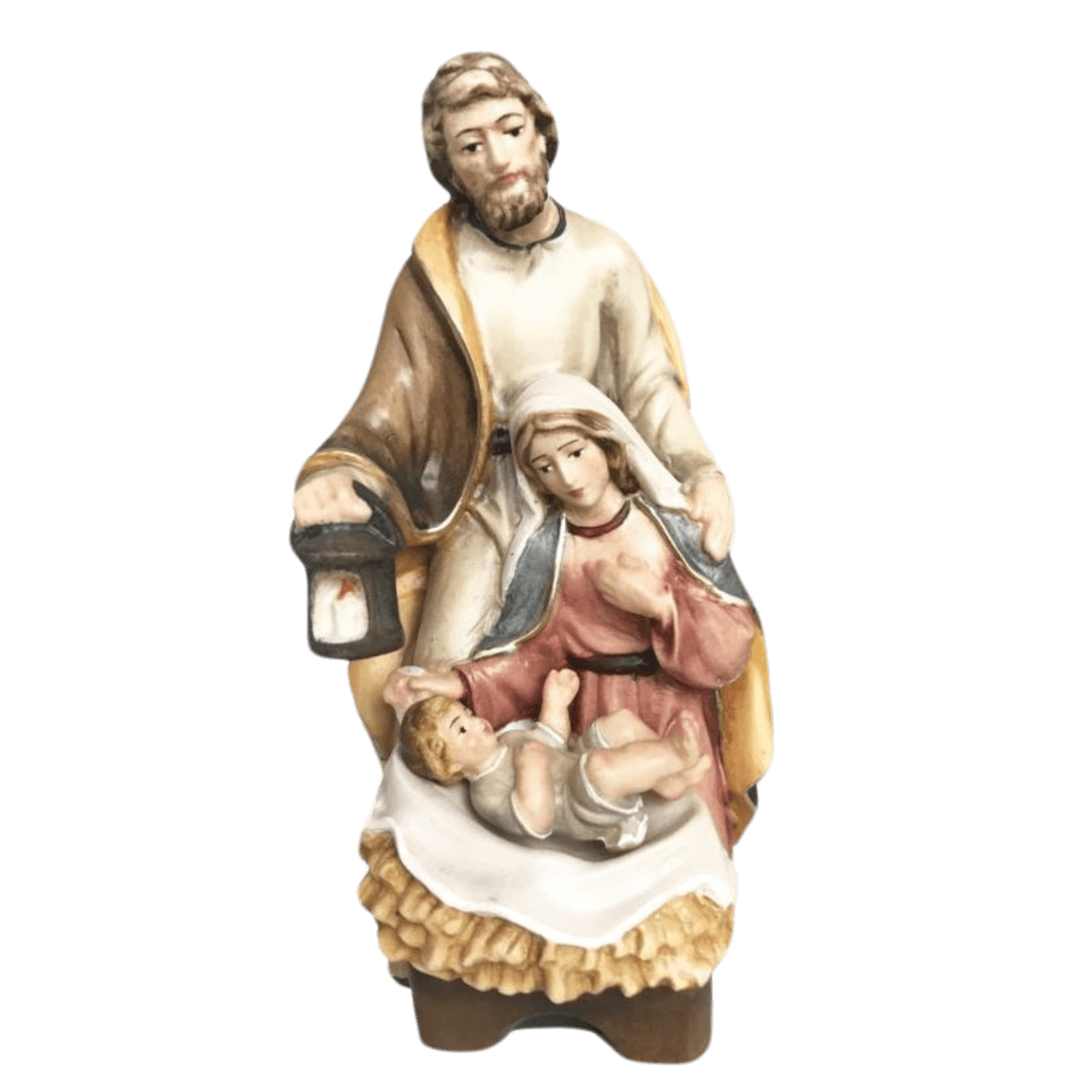 Este belén de madera tallada, meticulosamente hecho a mano y pintado, captura con ternura la Natividad de Jesús con María y José. Una obra de artesanía atemporal que aporta calidez y devoción a cualquier hogar cristiano.