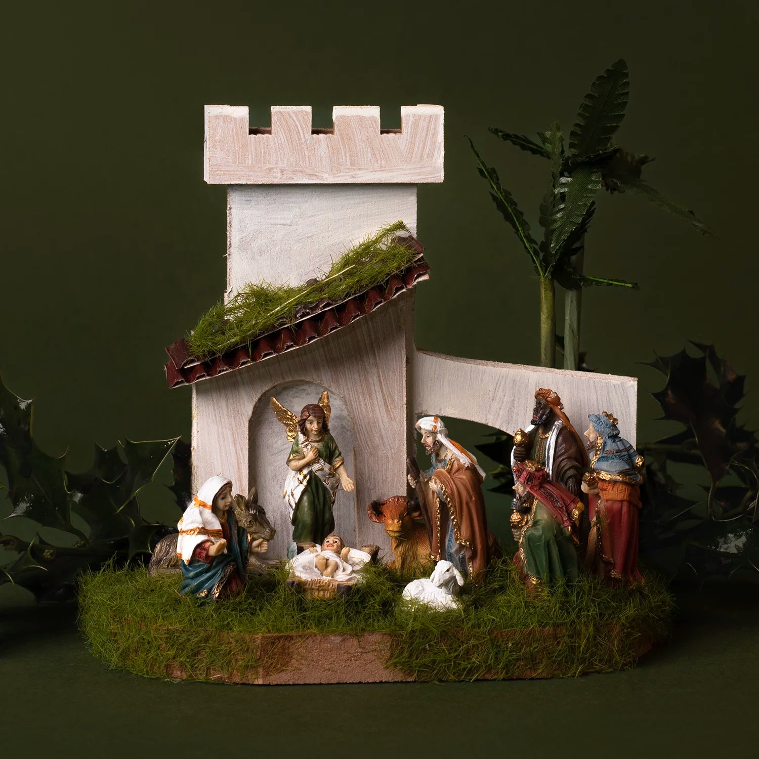 Pesebre compuesto por una cabaña de madera y los personajes en resina.