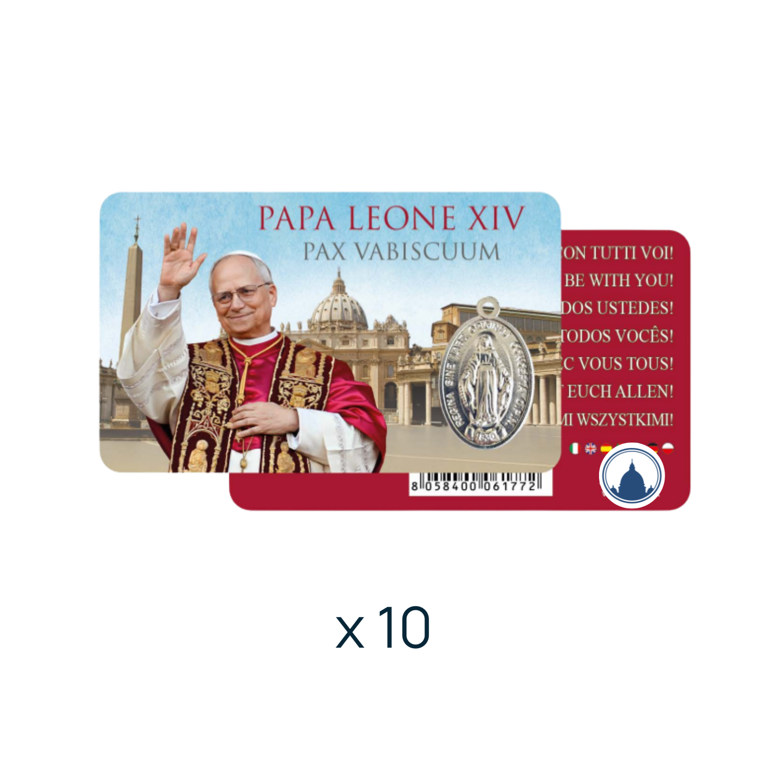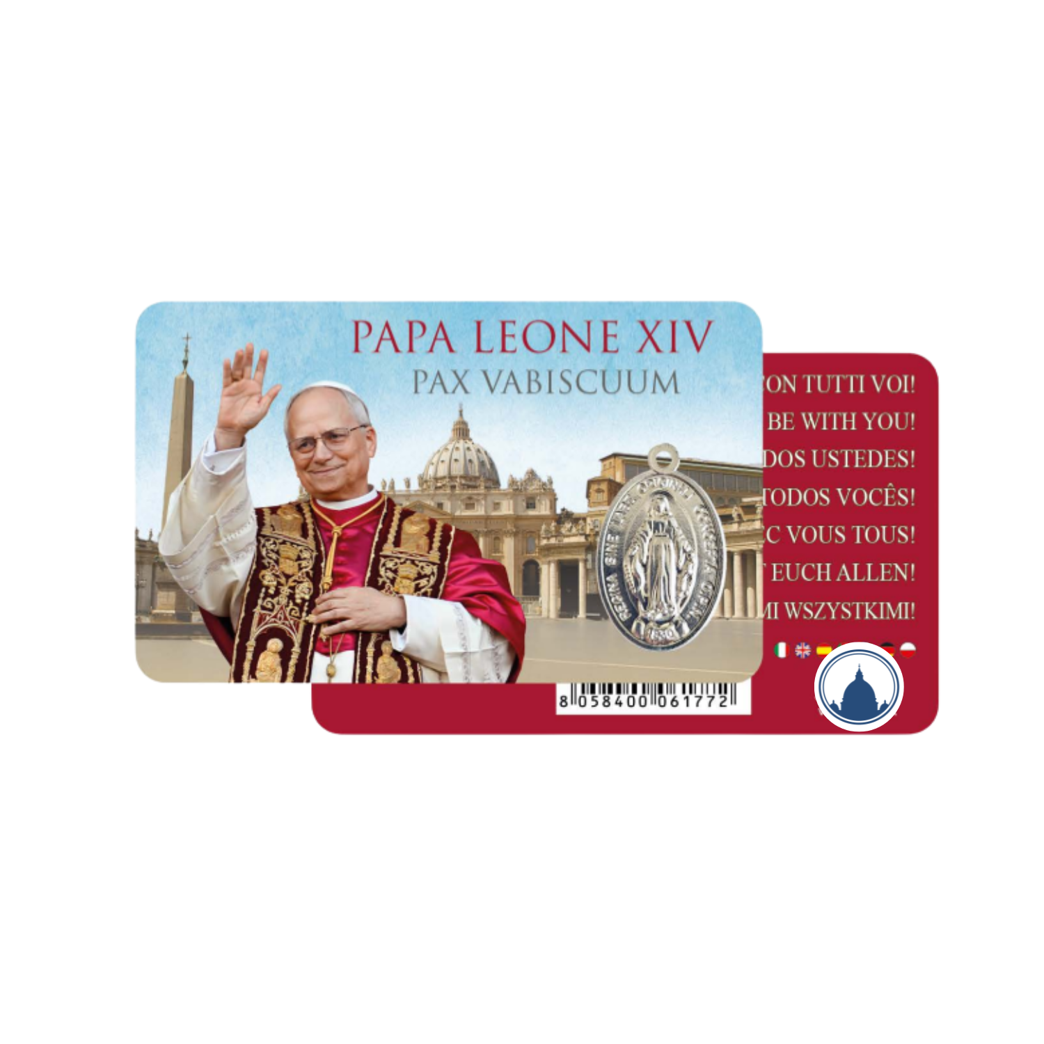 Estampa religiosa del Papa León XIV. En el anverso, figura la Medalla Milagrosa con la frase en latín «PAPA LEONE XIV PAX VOBISCUM», que significa « La paz sea contigo ».