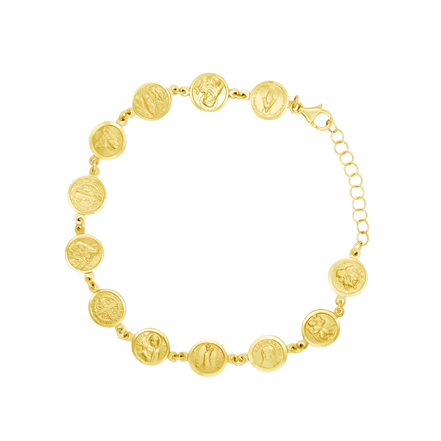 Descubra la belleza de la joyería católica con esta pulsera de oro de 18kt adornada con medallas católicas. Esta pulsera cristiana celebra su fe y garantiza la protección de María, San Benito y los santos más famosos. Cada medalla cuenta una historia de devoción, lo que la convierte en un preciado recordatorio de su fe.