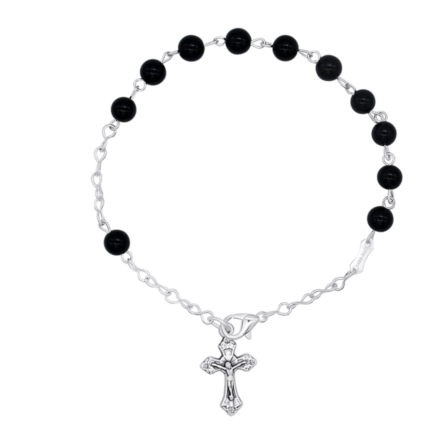 Rosario con cuentas redondas de Ónice y una Medalla Milagrosa vidriada.