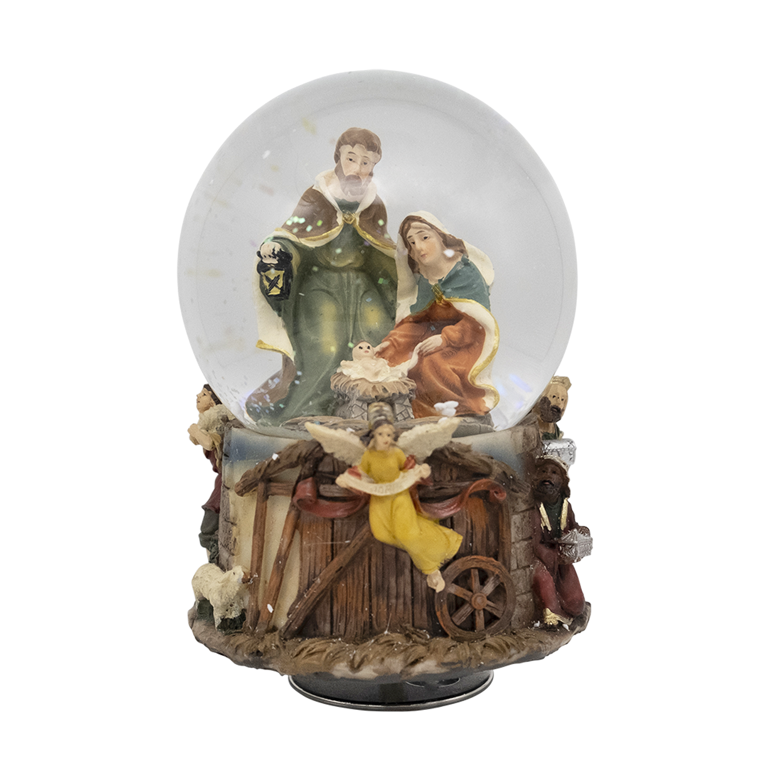 Bola de nieve navideña con carillón, realizada íntegramente en resina y vidrio. La bola de nieve contiene el belén y reproduce el famoso villancico "Noche de Paz".