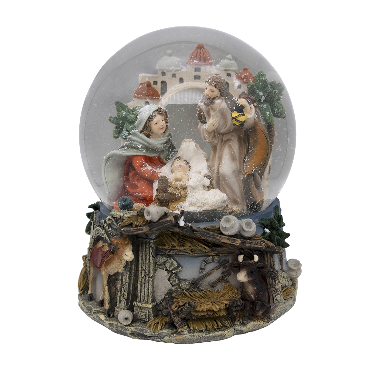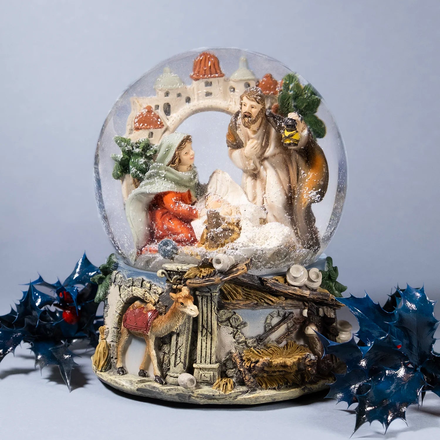 Lleve el verdadero espíritu navideño a su hogar con este gran globo de nieve musical con belén, exquisitamente detallado. Esta impresionante pieza cuenta con figuras finamente elaboradas, entre las que se incluyen María, José y el niño Jesús dentro del globo. Cuando se activa, el globo de nieve reproduce el querido villancico «Noche de paz», creando un ambiente tranquilo y festivo.