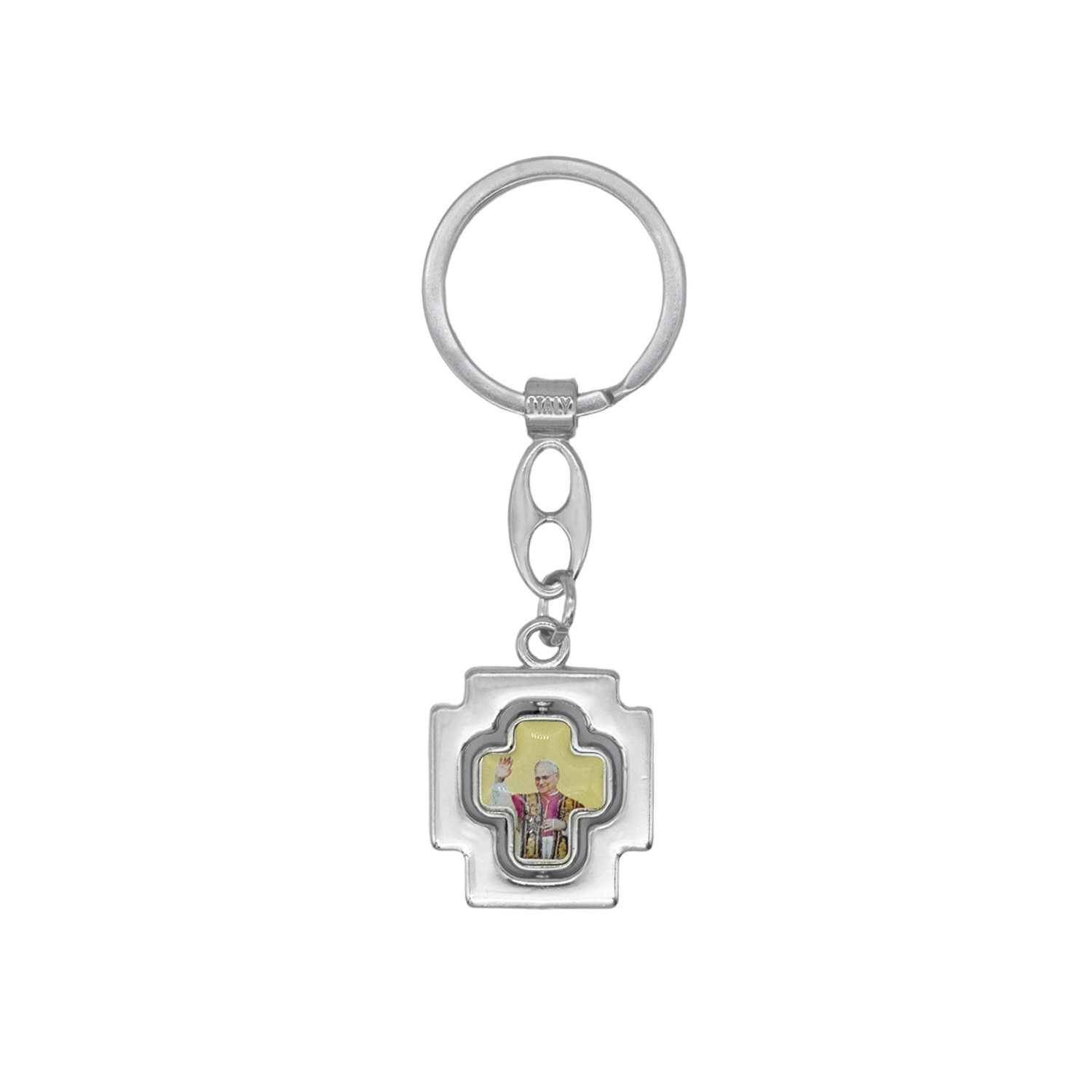 Este llavero presenta un colgante en forma de cruz con la imagen del Papa León XIV. Fabricado en metal.