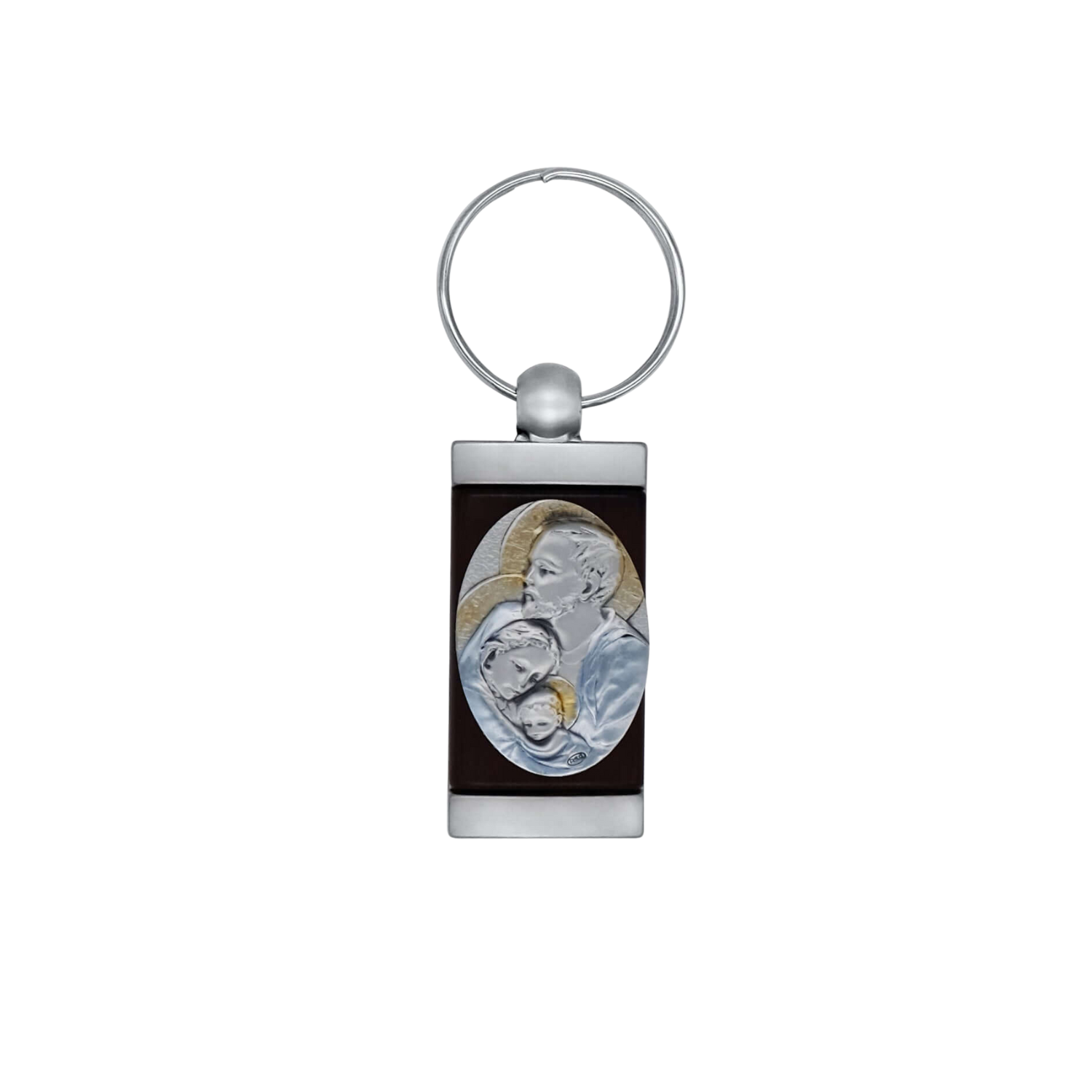 Finamente elaborado en metal, consta de una placa metálica que descansa sobre una base rectangular de madera.