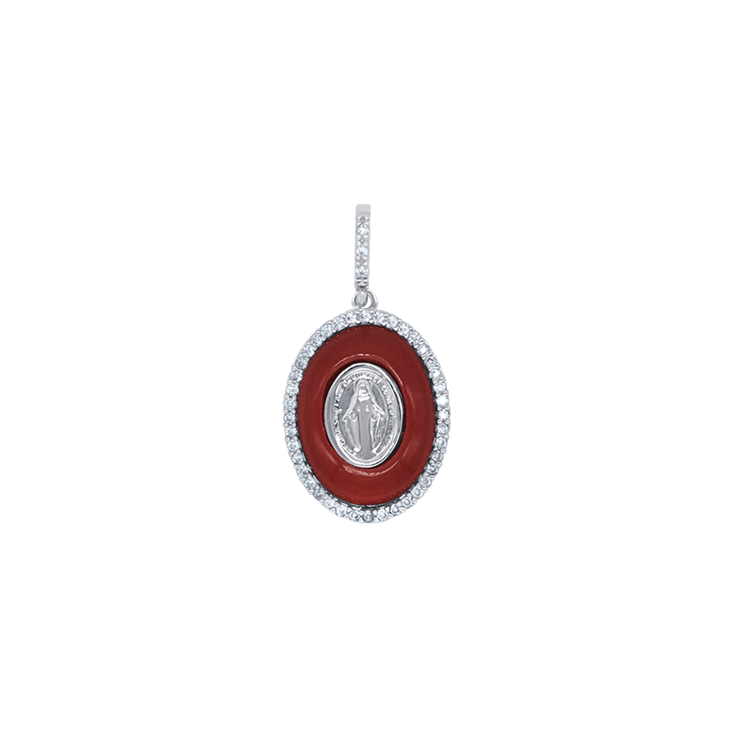 Esta Medalla Milagrosa de plata de ley luce un intenso centro rojo, rodeado de brillantes circonitas cúbicas. En su interior, la Virgen María se representa con delicadeza, como símbolo eterno de fe y elegancia.