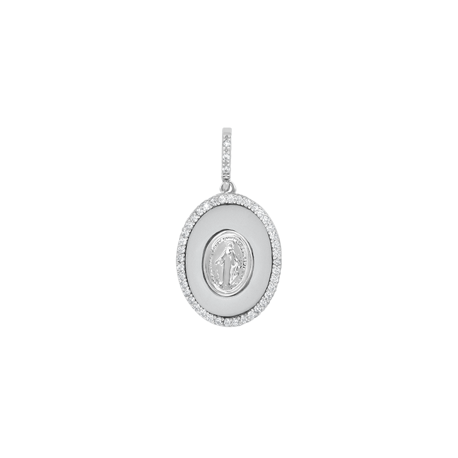 Esta Medalla Milagrosa de plata de ley luce un centro blanco, rodeado de brillantes circonitas cúbicas. En su interior, la Virgen María se representa con delicadeza, como símbolo eterno de fe y elegancia.