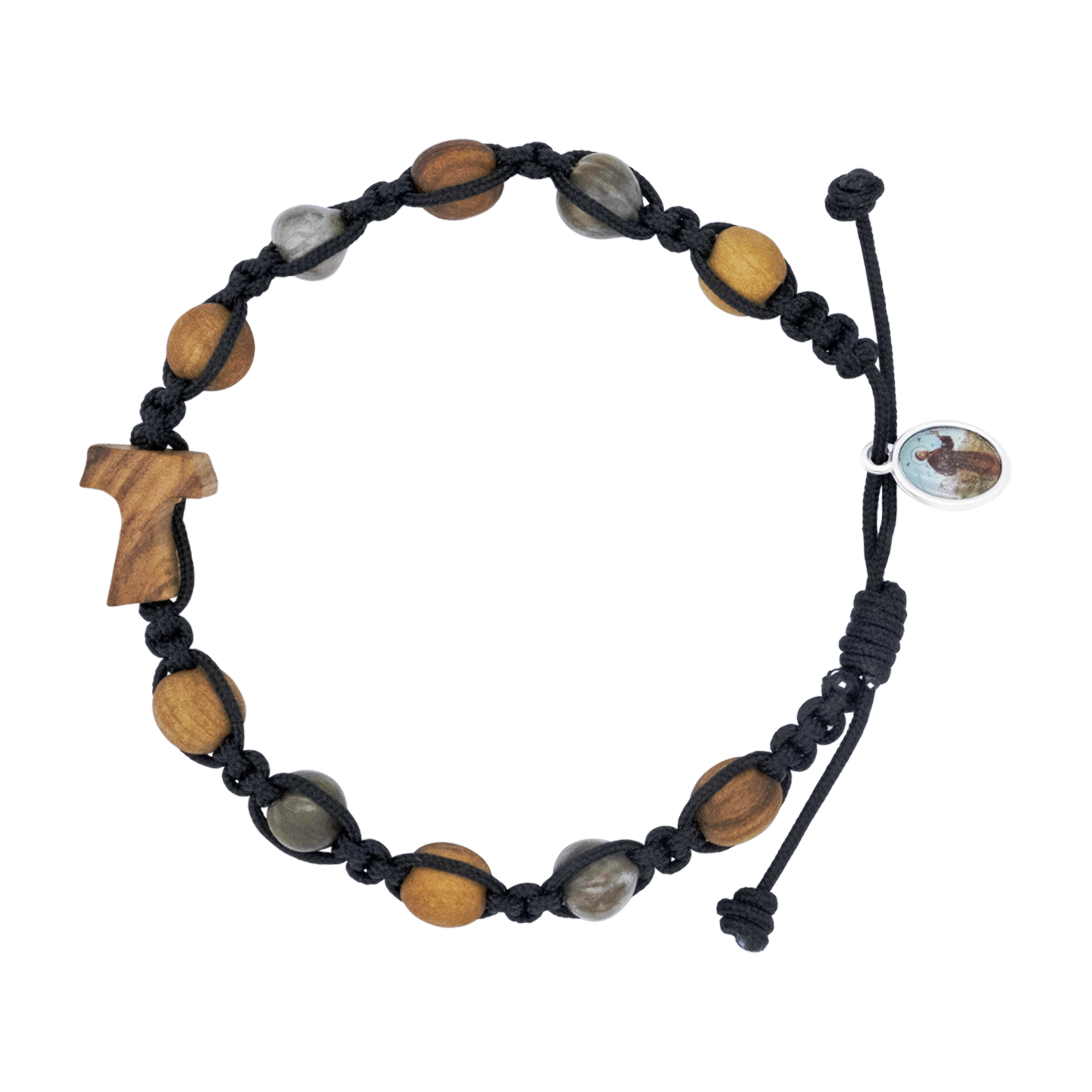 Pulsera rosario de decena con cruz Tau y medalla de San Francisco de Asís. Esta pulsera de madera de olivo con piedras naturales fue trenzada a mano con hilo de alta calidad.