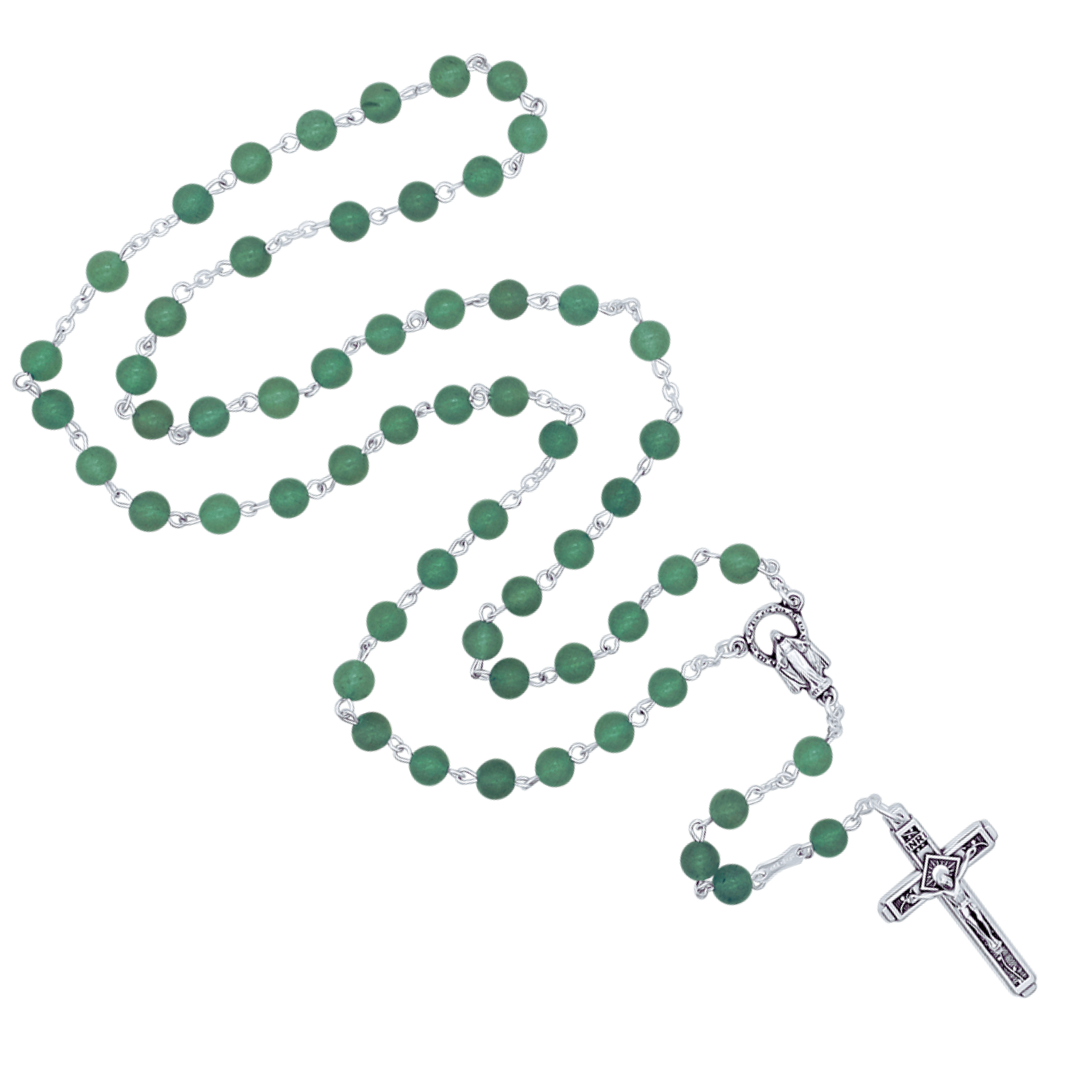 Inspira tus oraciones diarias con este santo rosario, compuesto por auténticas piedras de aventurina en tonos verdes. Cadena y cierre metálicos. La medalla central representa a la Santísima Virgen María.