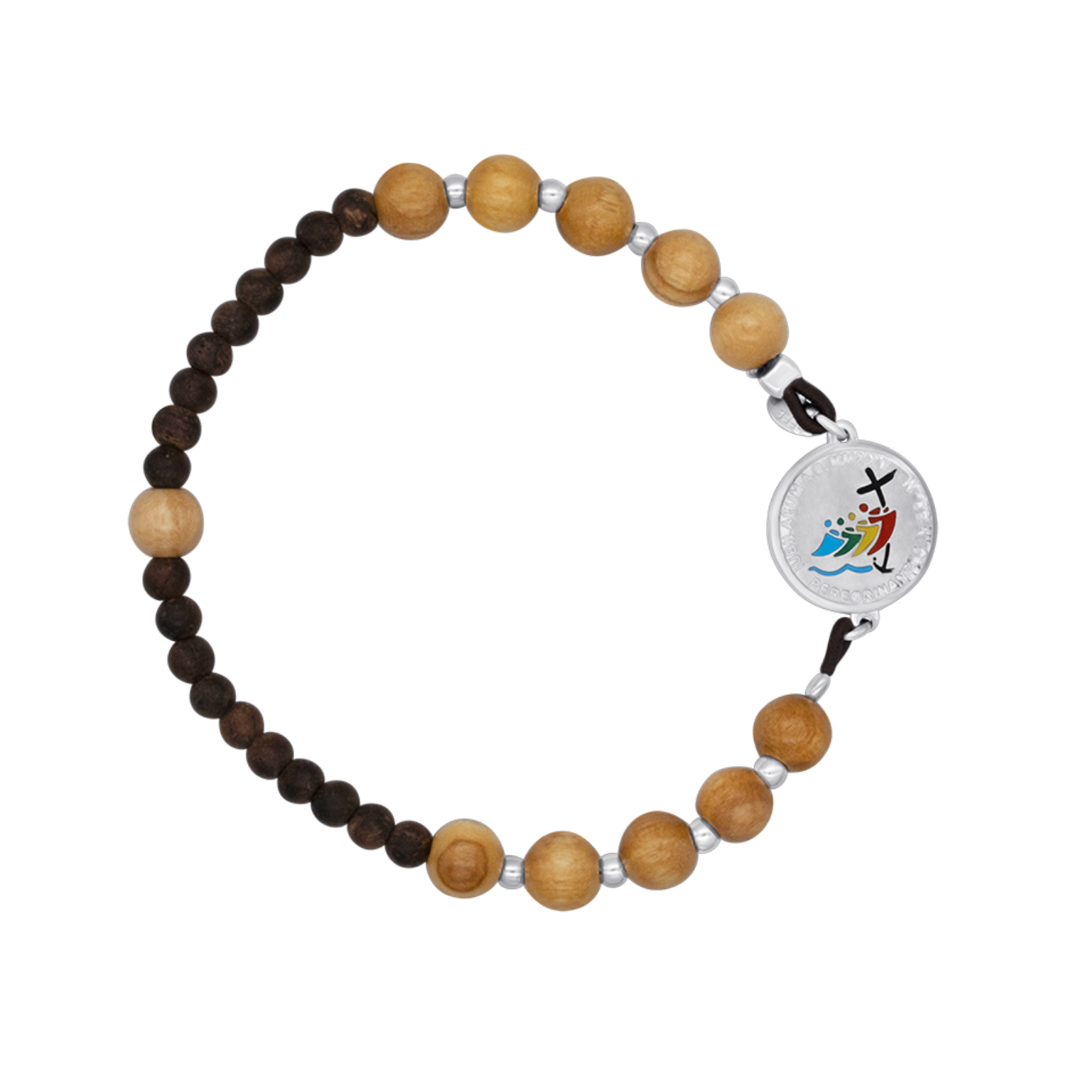 Esta pulsera, creada para celebrar el Año Santo, está elaborada con cuentas de madera de olivo. Una medalla de plata dorada con el logotipo oficial del Jubileo 2025 Peregrinos de la Esperanza se integra con elegancia en el nudo de cierre.