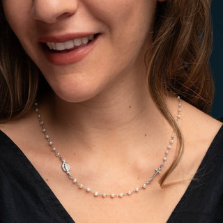 Collar de cinco decenas en Plata de ley 925 y microcuentas lisas. El collar tiene una cruz y la medalla de la Virgen Milagrosa.