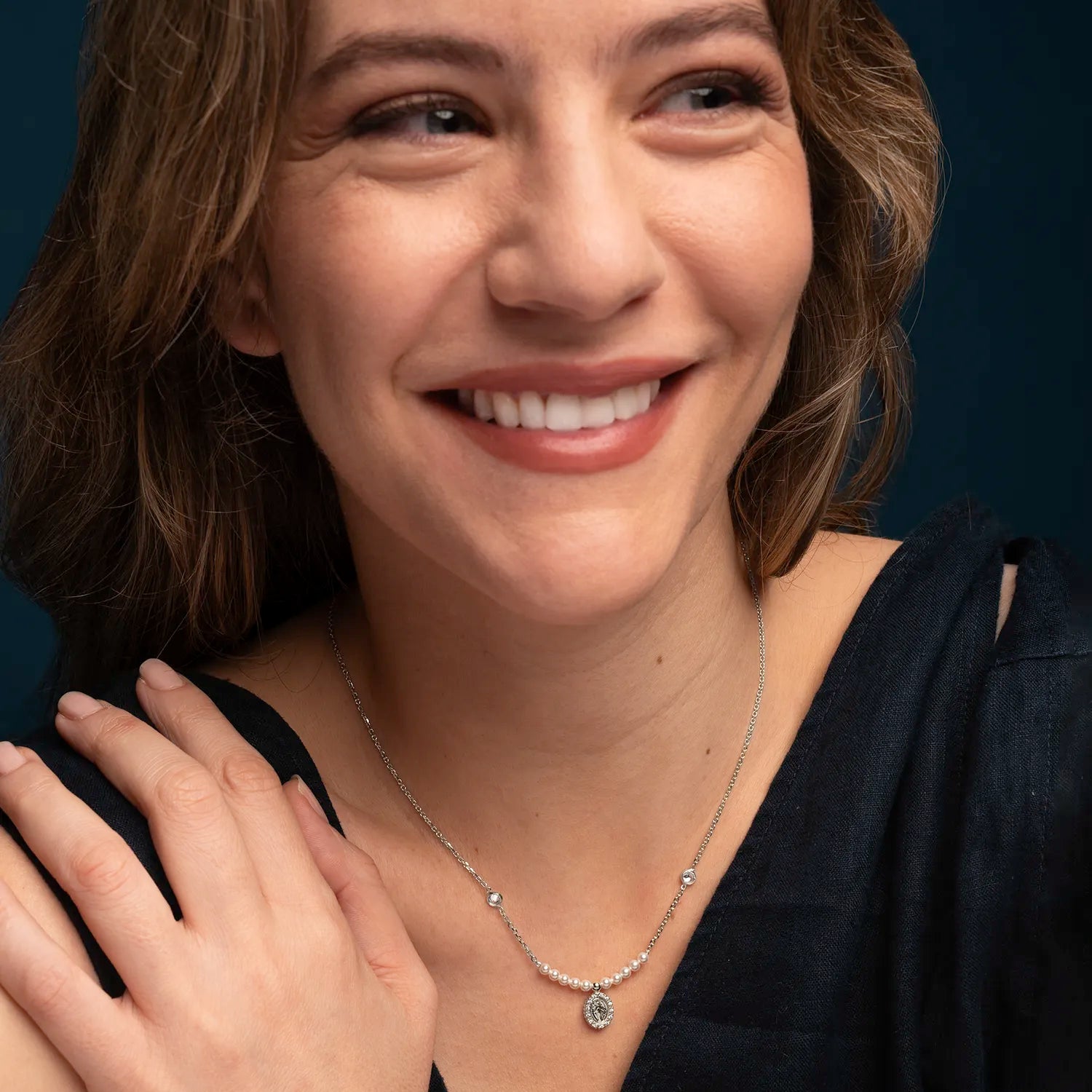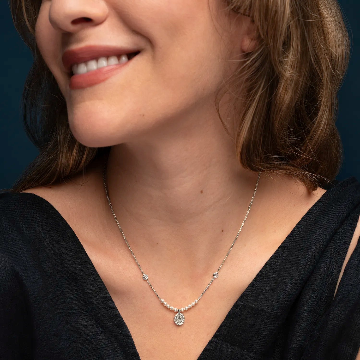 Elegantemente delicado, este collar medalla milagrosa de plata está adornado con relucientes perlas blancas. Elaborado con meticulosa atención al detalle, encarna la elegancia y la sofisticación, iluminando como un profundo símbolo de fe y devoción. Un regalo ideal para ella, apto para cualquier ocasión, que irradia una belleza atemporal y un sentimiento sincero.