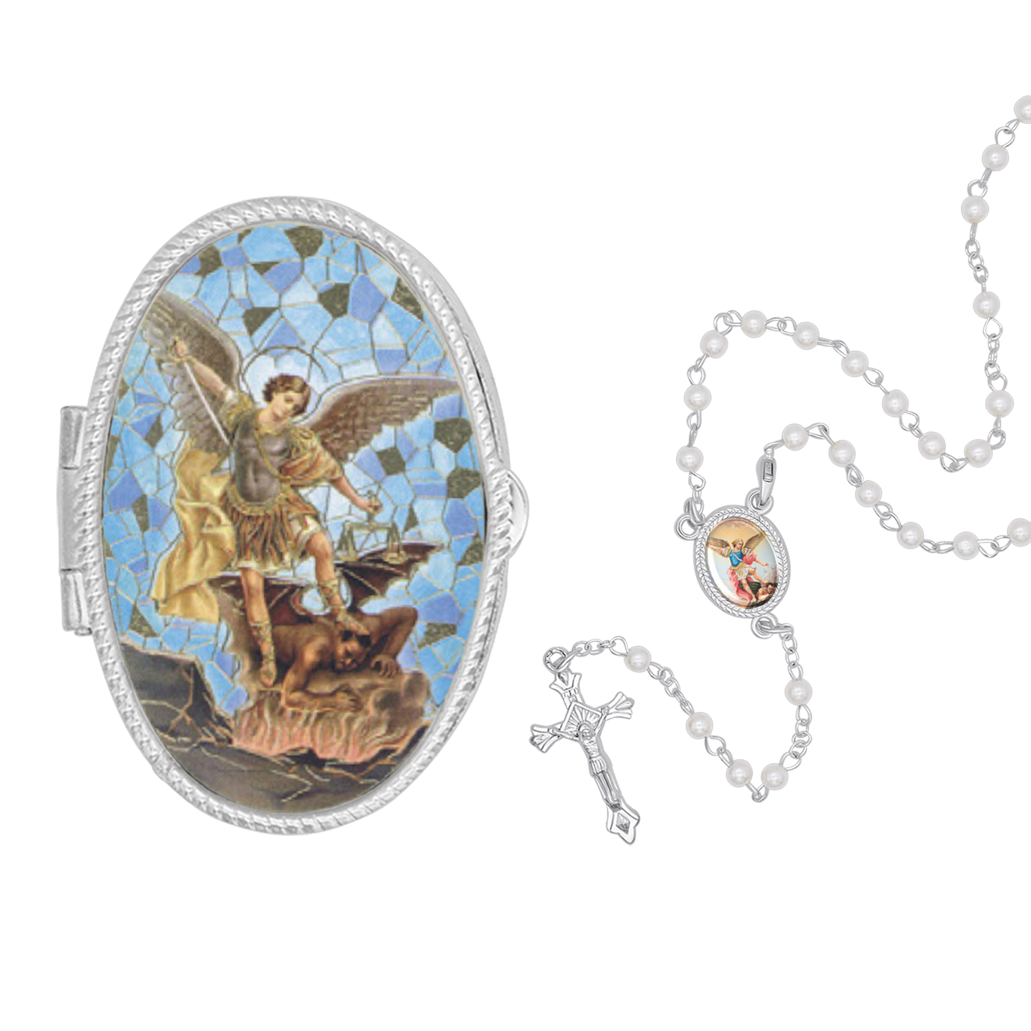 Cajita rosario que representa a San Miguel Arcángel. Dentro de la cajita, hay un rosario con cuentas de color morado. La medalla central del rosario representa a la Virgen, la Santa Madre de Jesús Cristo, nuestro Salvador.