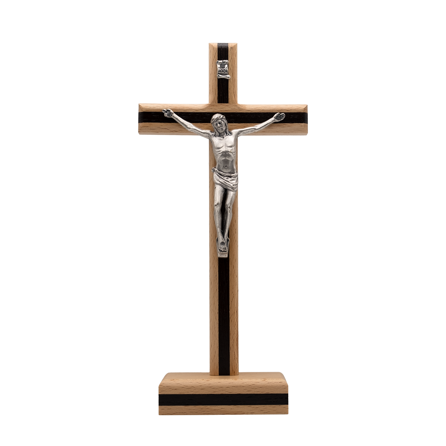 Crucifijo de mesa enteramente realizado en madera bicolor y metal, con un pequeño pedestal a la base.