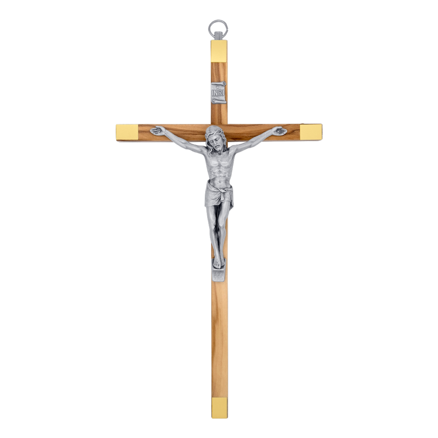 Crucifijo de madera de olivo con Cristo plateado. Disponible en tres tamaños diferentes.