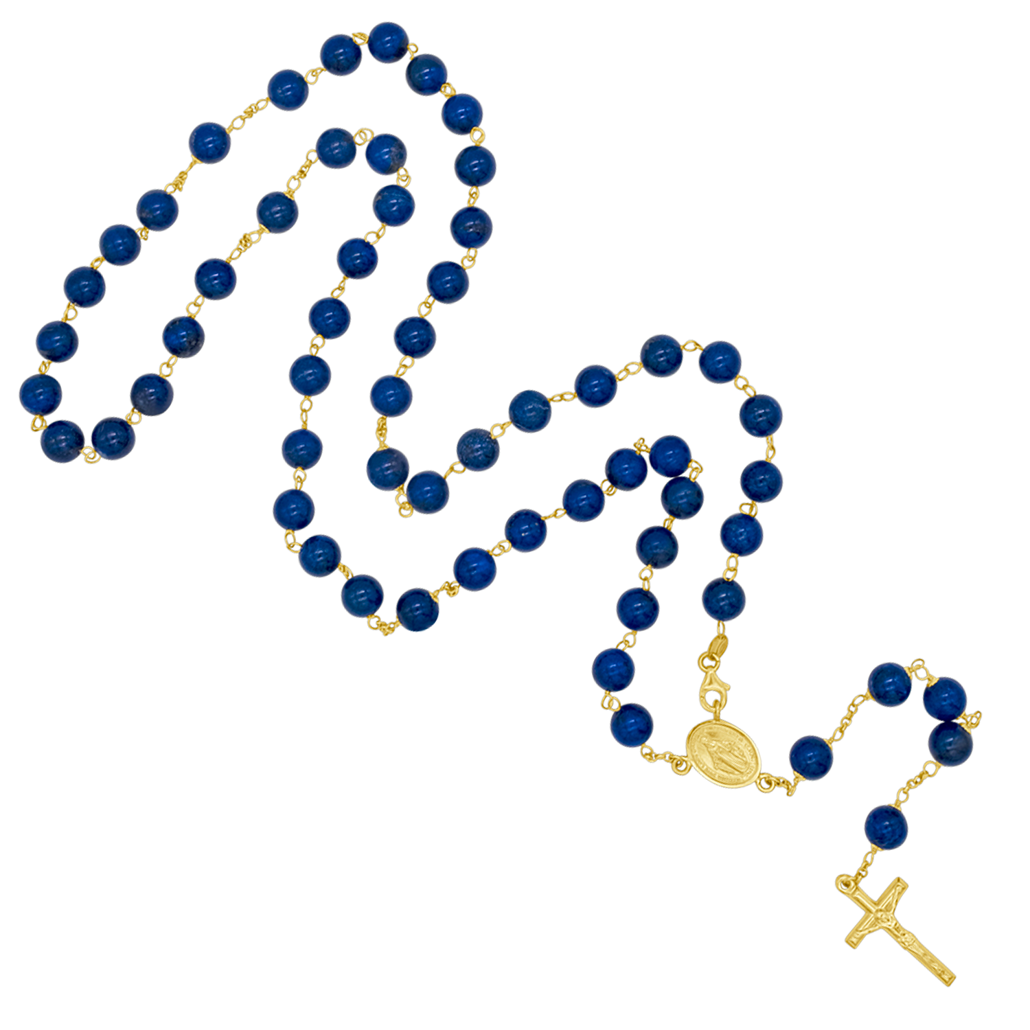 Le perle di lapislazzuli blu intenso conferiscono a questo rosario un aspetto sorprendente e senza tempo. Interamente realizzato con legature in oro 18kt, presenta al centro una Medaglia Miracolosa, simbolo prezioso della grazia e della protezione di Maria. Tradizionalmente associato alla spiritualità e alla devozione, questo rosario di lapis lazuli è pensato come un regalo prezioso per le occasioni importanti. Disponibile in due misure.
