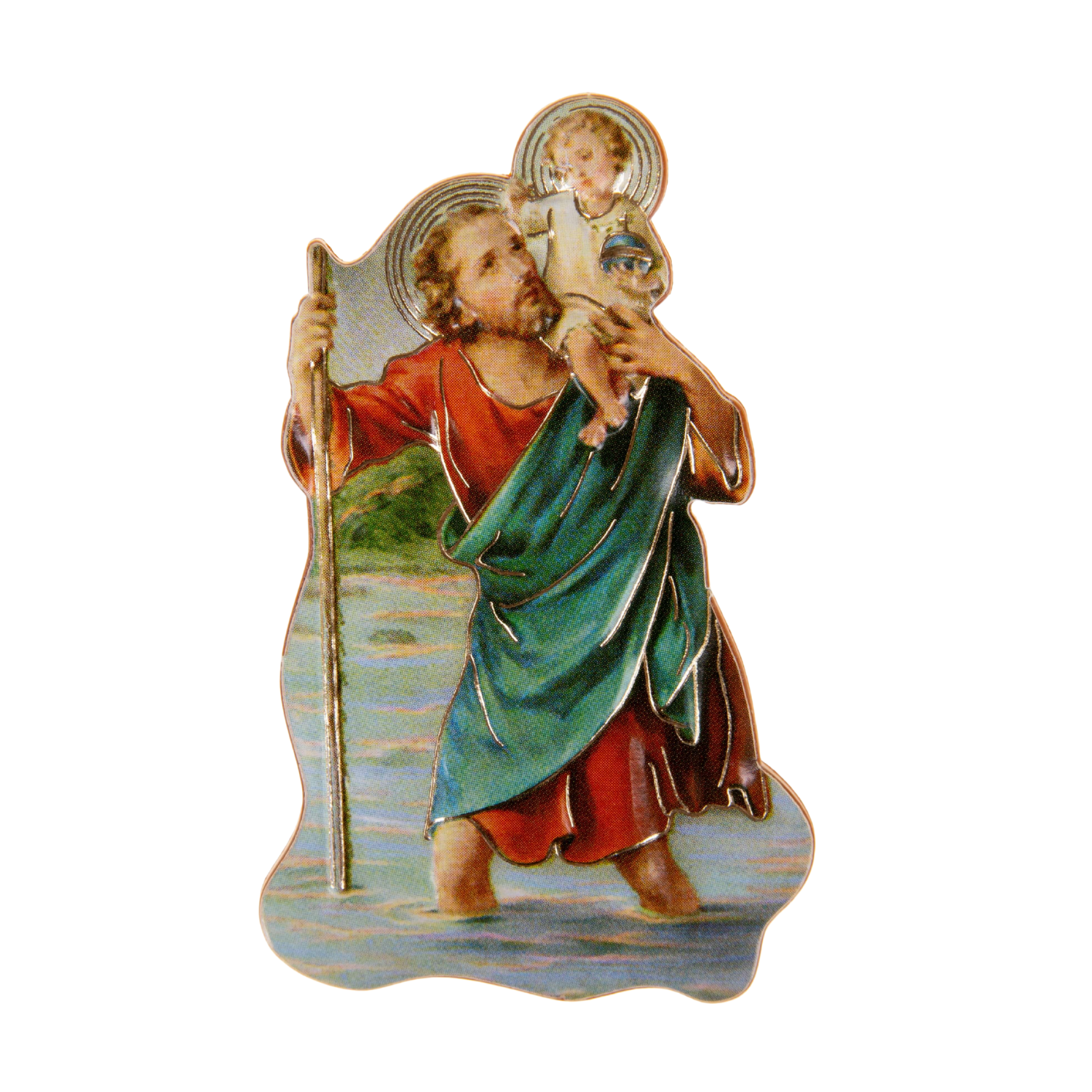 Magnete sagomato con immagine di San Cristoforo, amato protettore dei pellegrini. Questa calamita è l'ideale per abbellire con immagini sacre ogni superficie metallica della casa o dell'automobile. Realizzata in PVC.