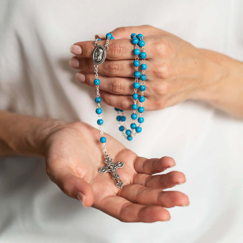 Simbolo di saggezza spirituale e speranza, l'azzurro spensierato dei grani in turchese rende questo rosario un grande classico. La medaglia centrale rappresenta la Vergine Maria, mentre il crocifisso traforato completa lo stile tradizionale. Da abbinare al suo bracciale rosario correlato.