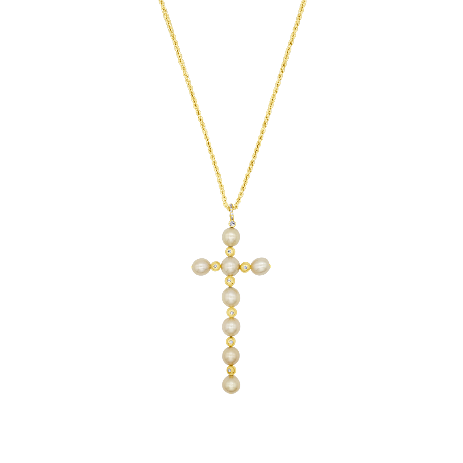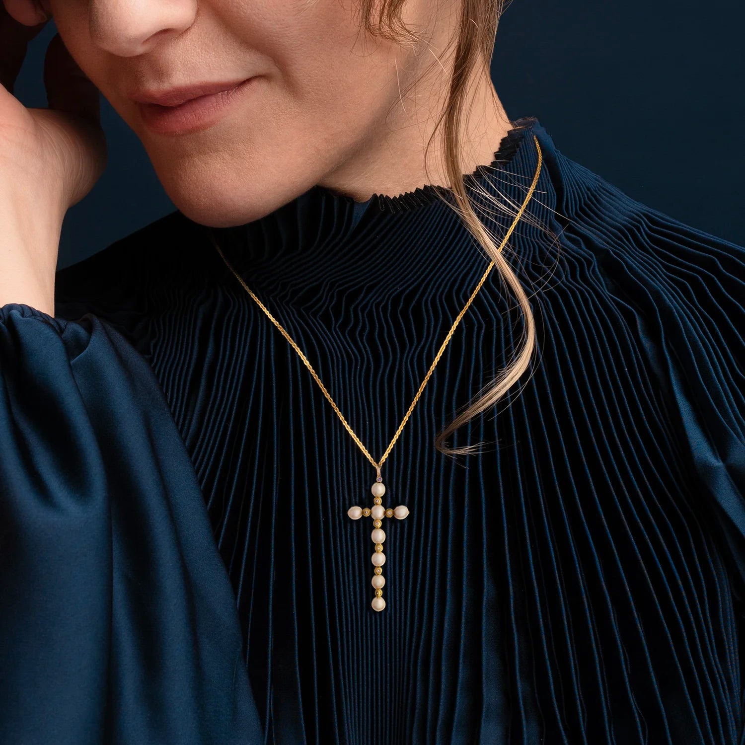 Elegante espressione di devozione, questa collana presenta una croce realizzata con perle luminose e oro 18k. La morbida luminosità delle perle crea un raffinato contrasto con i dettagli dorati, conferendo al design equilibrio e armonia.