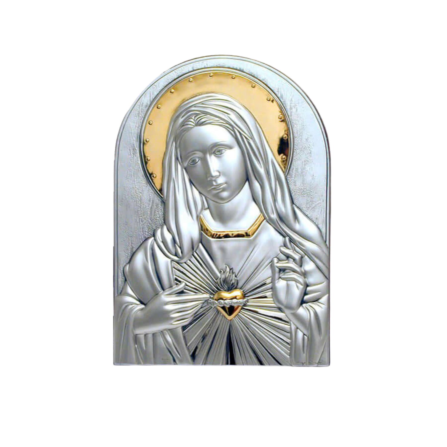 Quadro in Argento 925 raffigurante il Sacro Cuore di Maria. Questa figura simboleggia la sofferenza, il cuore della Vergine che soffre per la punizione inflitta dall’uomo a il figlio Gesù Cristo. Una lavorazione eseguita con grande maestria e spirito di assoluta devozione, verso una figura cara a coloro che più hanno rappresentato affetto e amore sincero attraverso la preghiera. Un’opera che mette in risalto tutto il suo valore, grazie alla sapiente opera artigianale dei nostri artisti italiani.