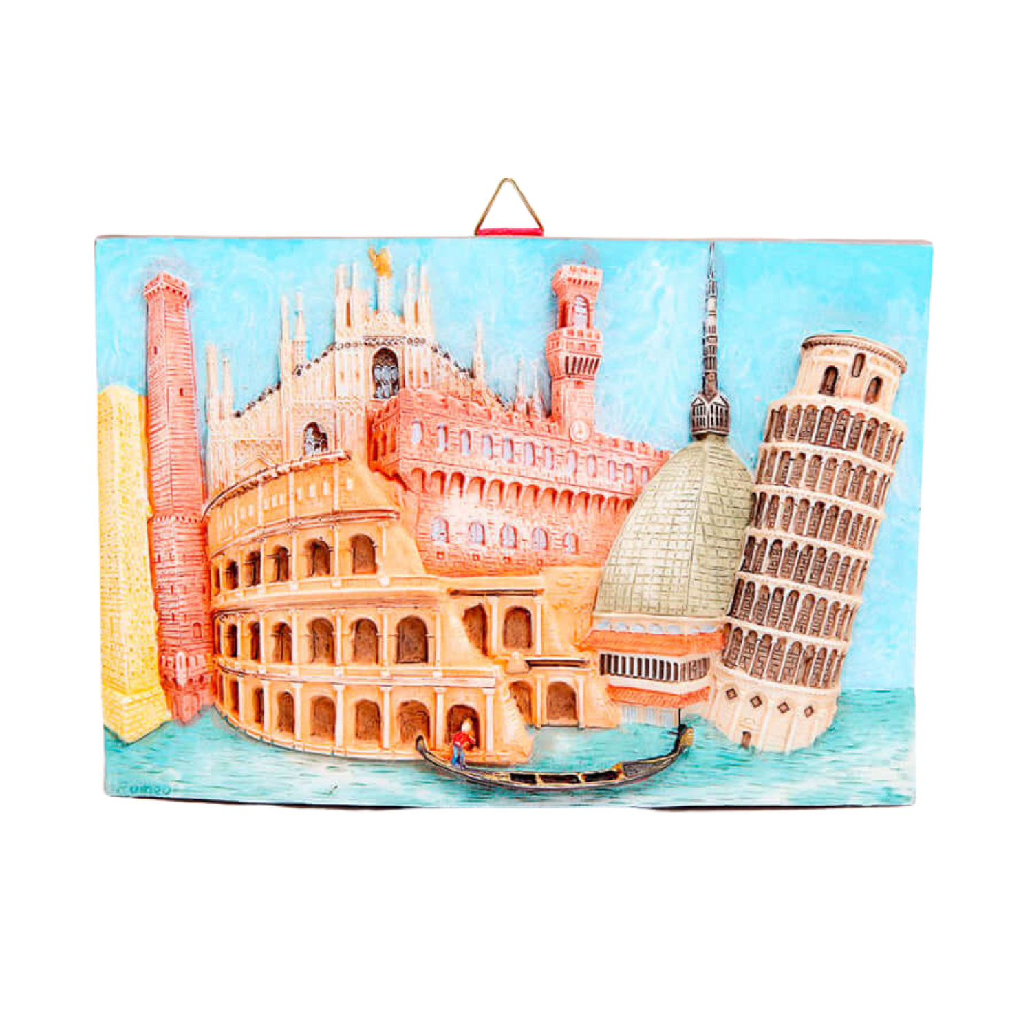 Quadro in polvere di marmo e resina raffigurante una serie di importanti monumenti presenti in Italia. Il quadro è stato eseguito in modo molto dettagliato, riproducendo anche i piccoli particolari presenti in questi monumenti. Il quadro è in rilievo, così che la figura può garantire maggiori dettagli tramite la profondità. La pittura eseguita a mano caratterizza l’opera dandole quell’aspetto particolare e originale. Un bellissimo ricordo di Roma, con le sue importanti opere monumentali e il fascino che la contraddistingue da sempre.