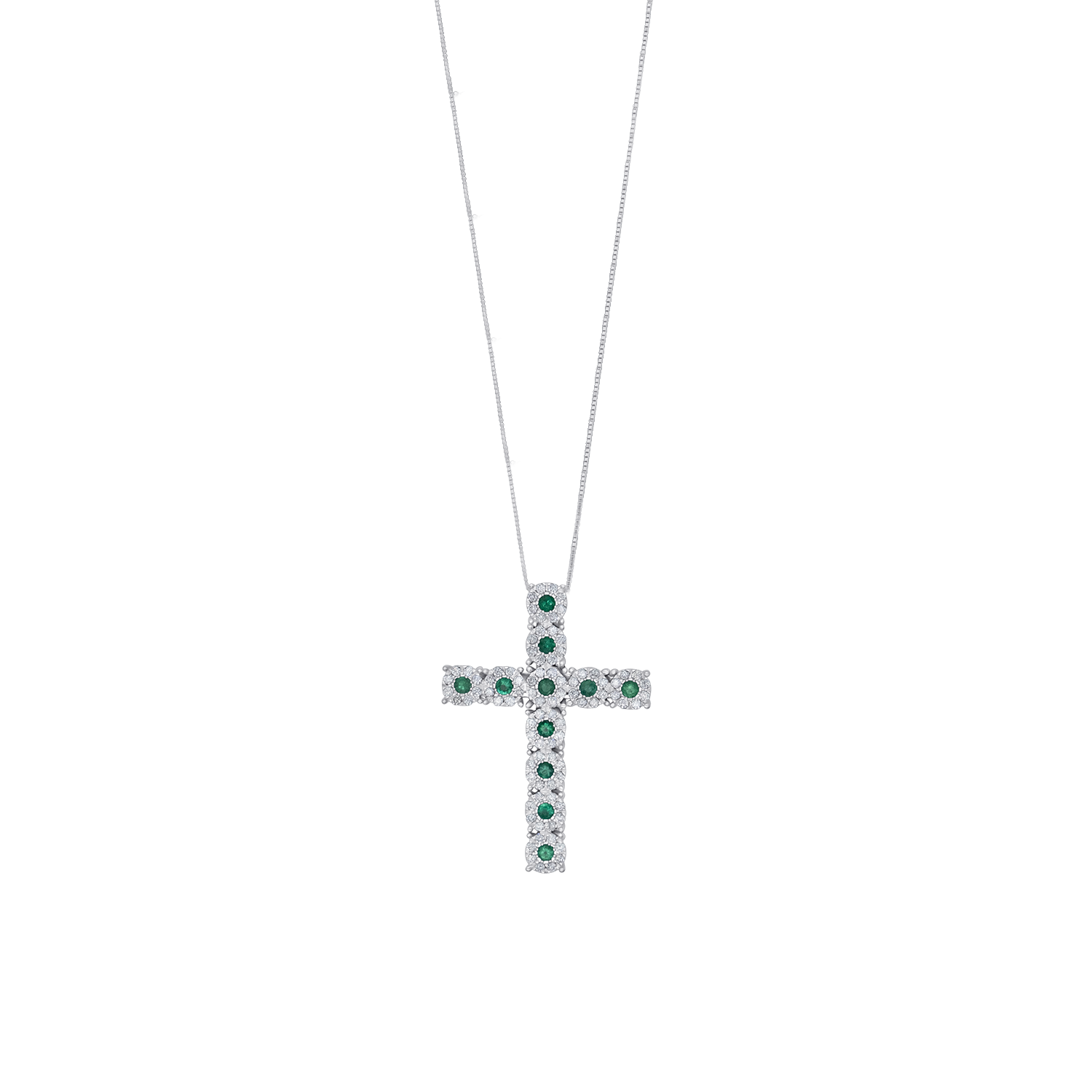 Un’elegante armonia di materiali preziosi, questa collana in oro bianco 18k presenta un pendente a croce impreziosito da smeraldi intensi e diamanti luminosi. Un gioiello dall’equilibrio raffinato, in cui i diamanti donano luce e definizione al disegno.