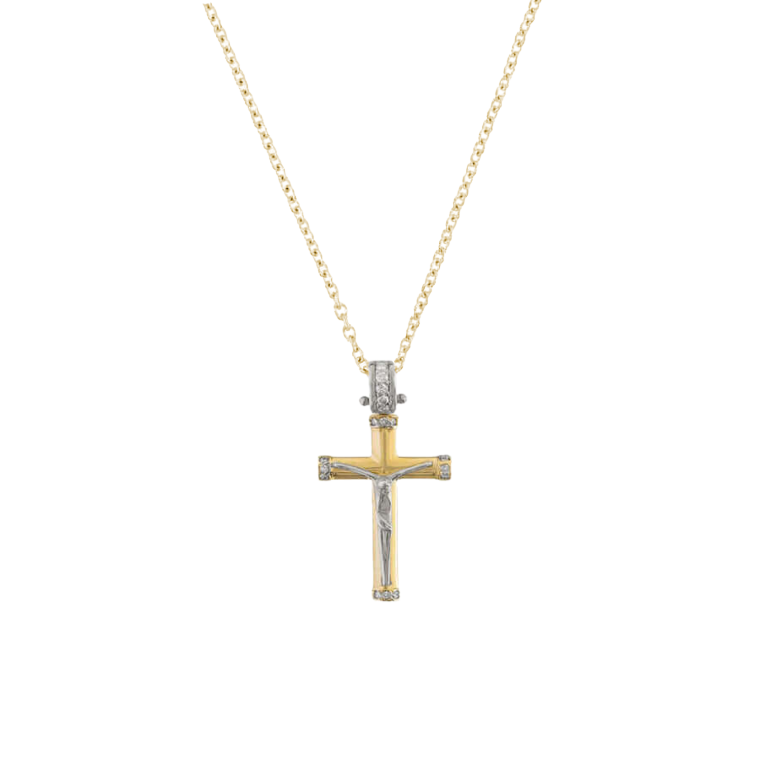 Set in Oro 18 Kt composto da catena ad anellini e Crocifisso a ciondolo con diamanti 0,18 Kt sulle punte e sul gancio. La lunghezza della catena è di 50 cm, mentre il ciondolo Crocifisso è di 25 mm.
